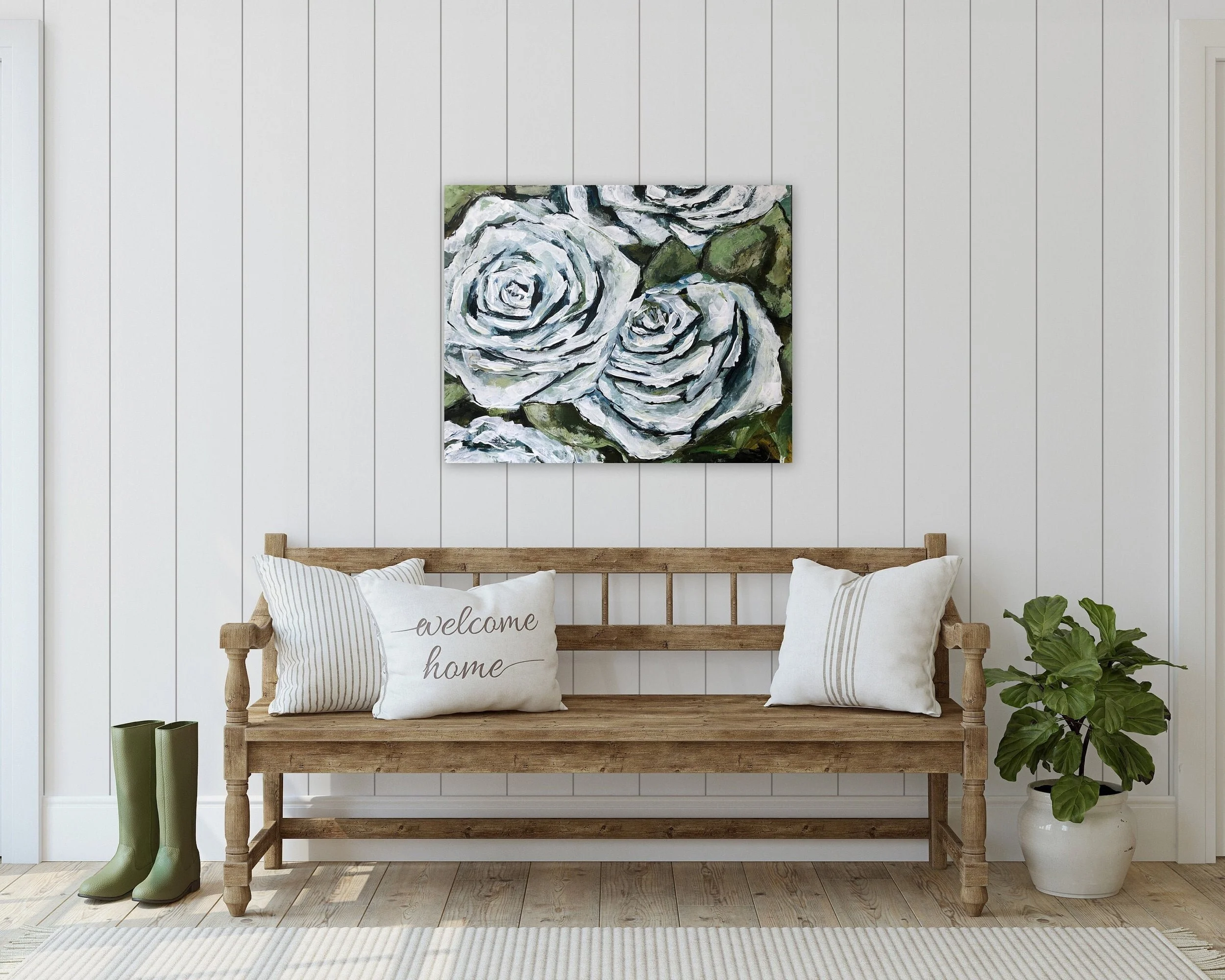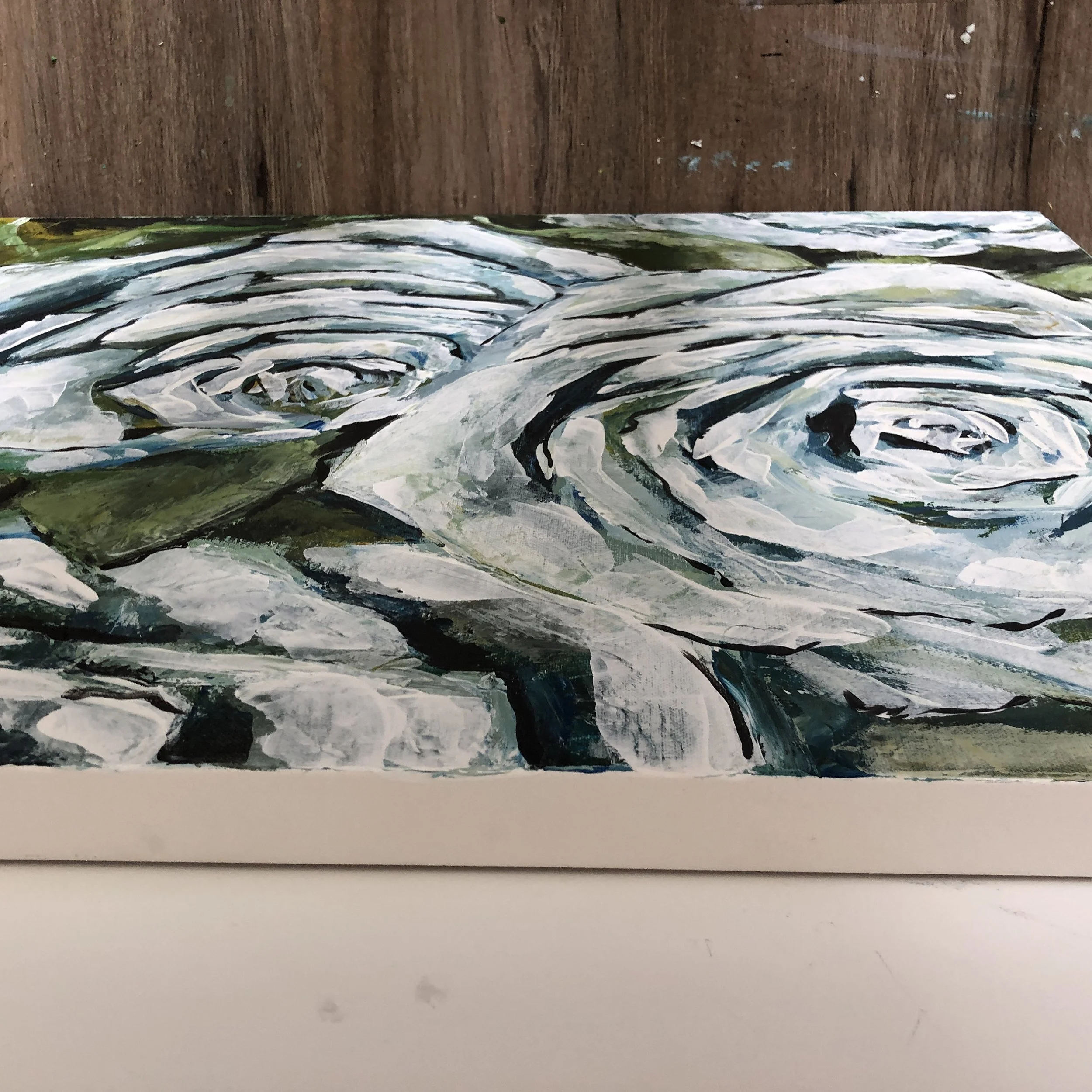 This painting will be shipped on its gallery wrapped wood frame. The edges are painted white so it can be hung right away or if you choose, this painting would look great with a floater frame as well.