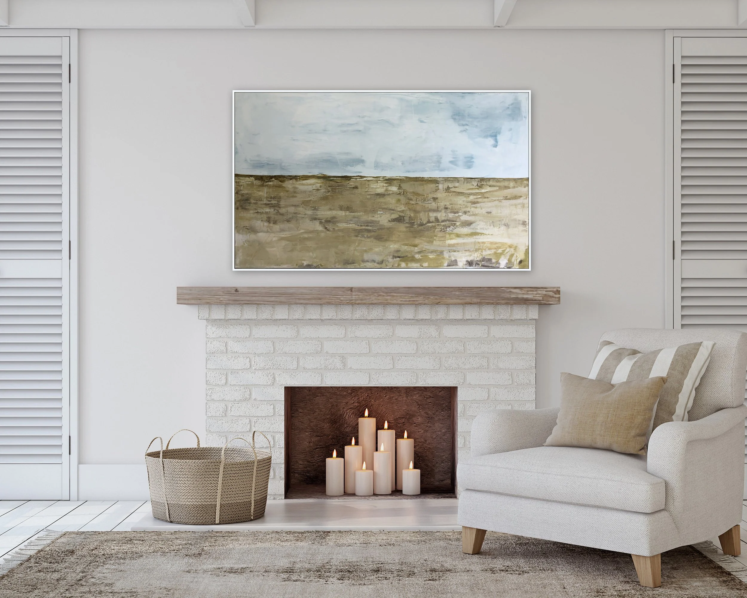 This is an acrylic, contemporary, farmhouse style, minimal landscape, scenery by Marcy Chapman.