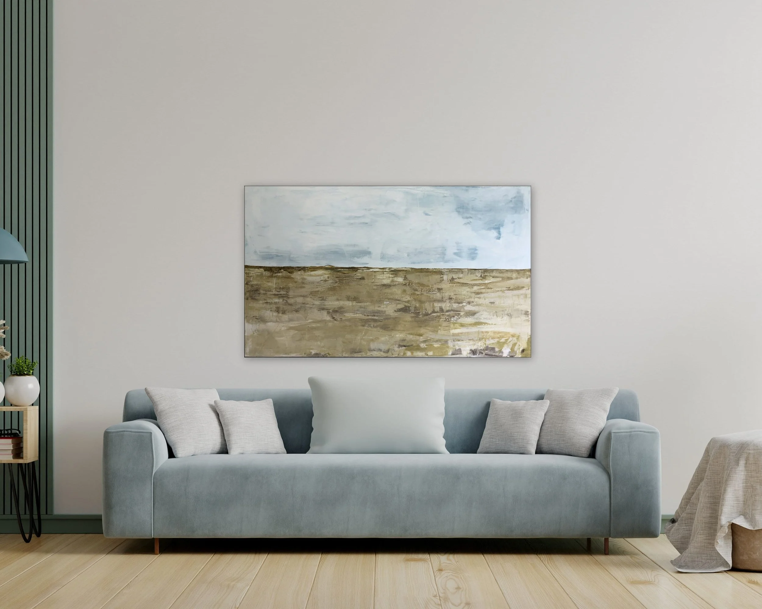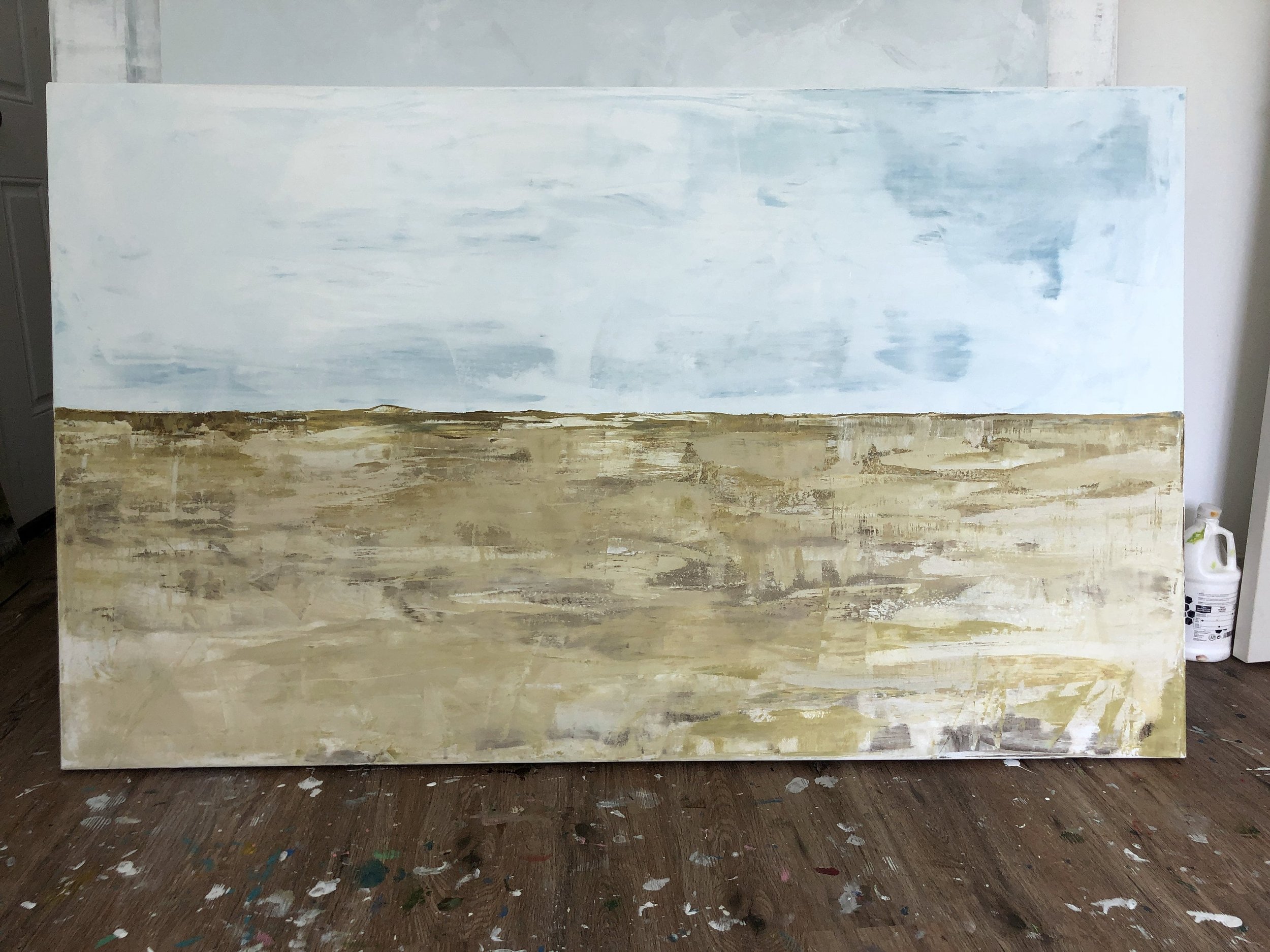 This painting is a very pretty minimal scene meant to portray fields of wheat at the time to harvest and a Big light blue sky to make it feel big and open with space to "breathe" in the fresh air.
