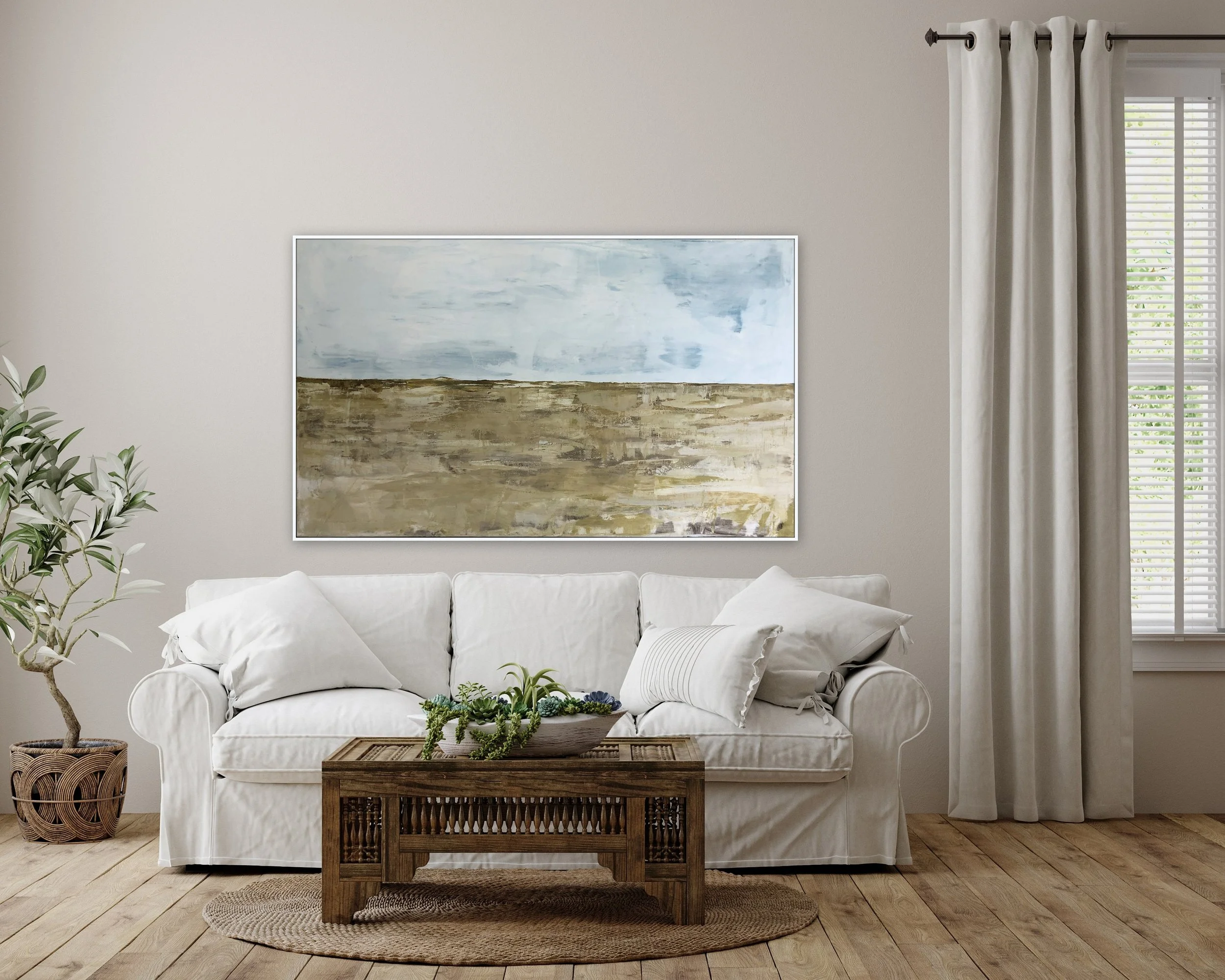 Size: 48" x 30" x 1.5" deep gallery wrapped wood frame.The edges are painted bright white, to give it a clean white frame look. Additional float frame would also look great an is an option for buyer.