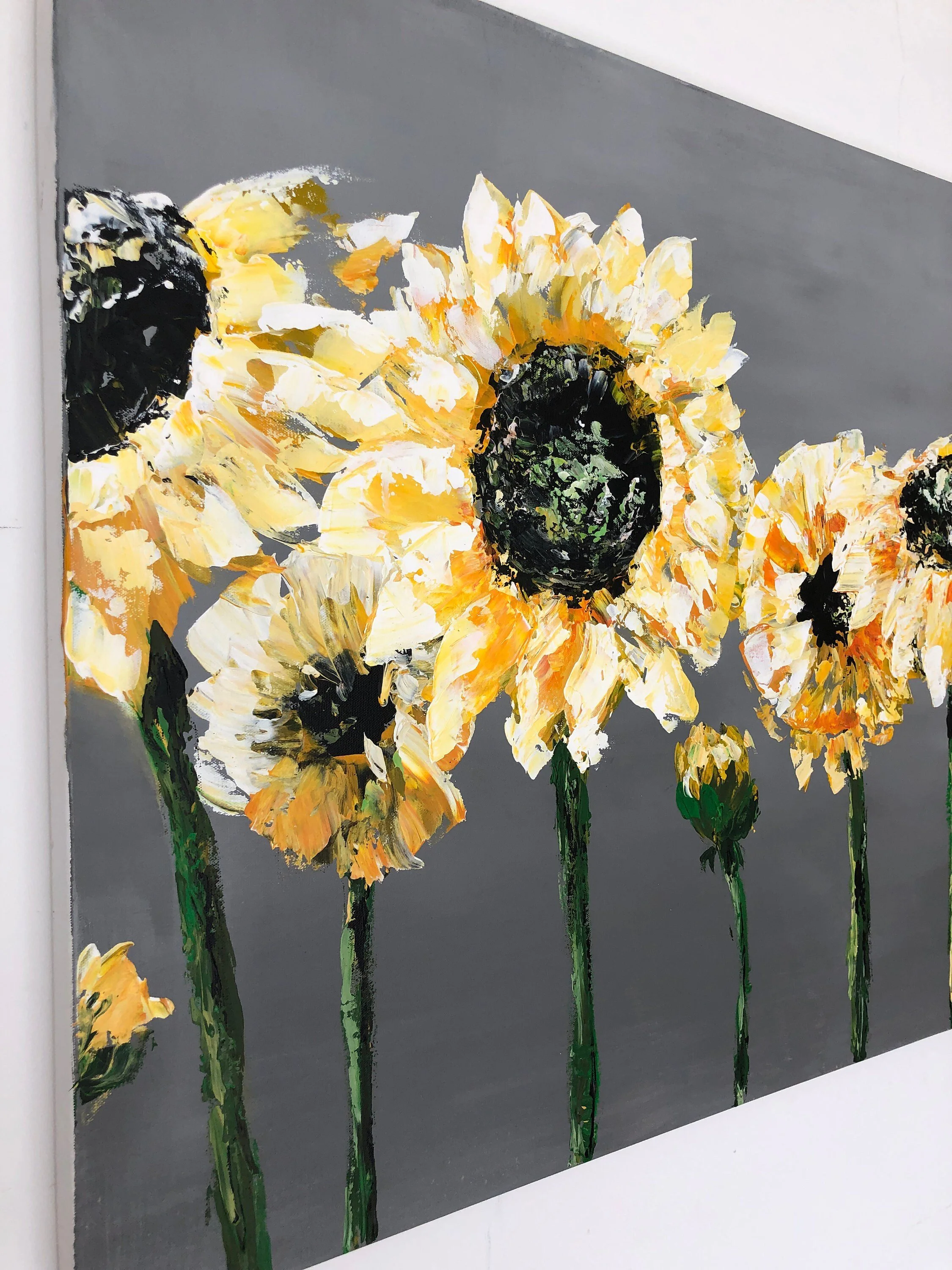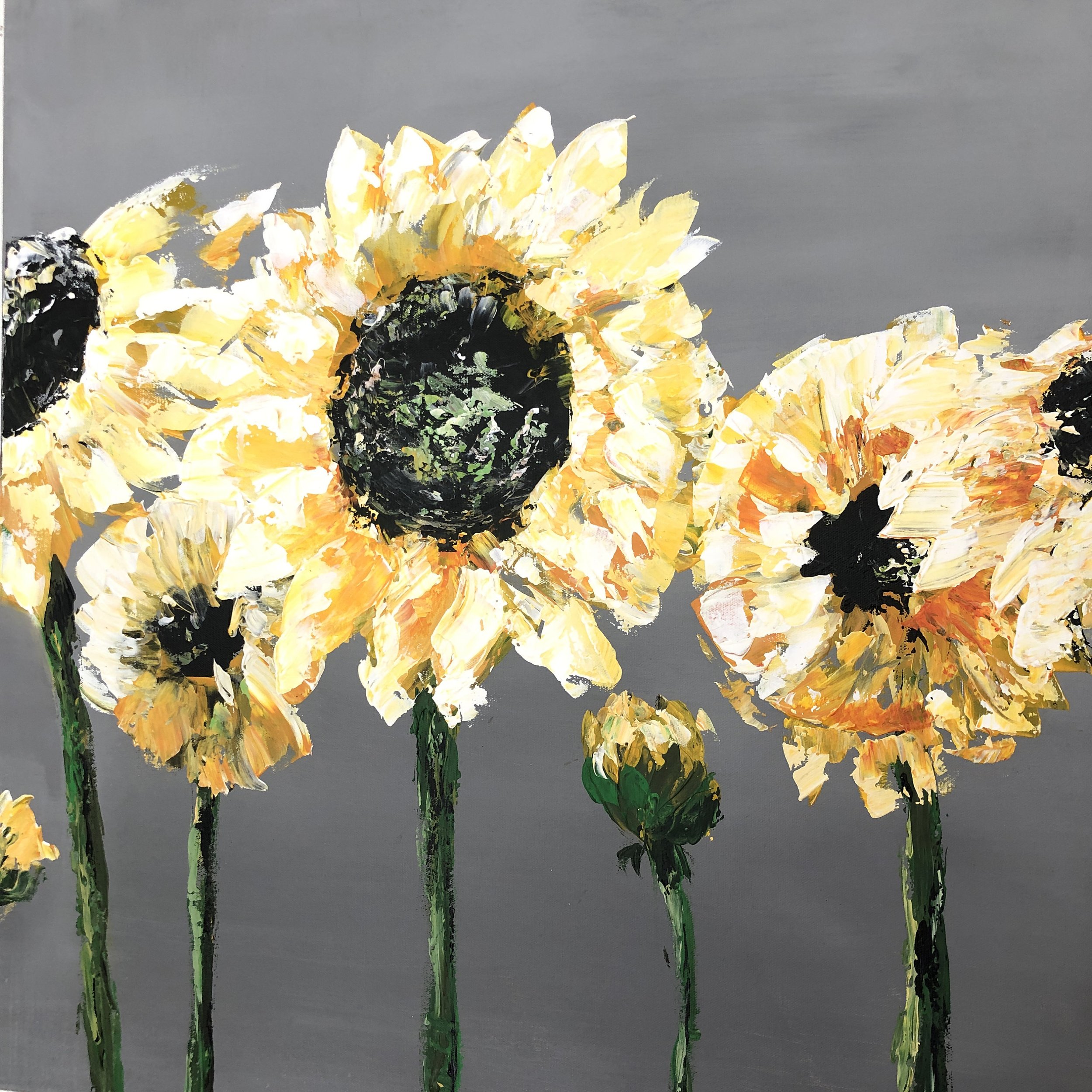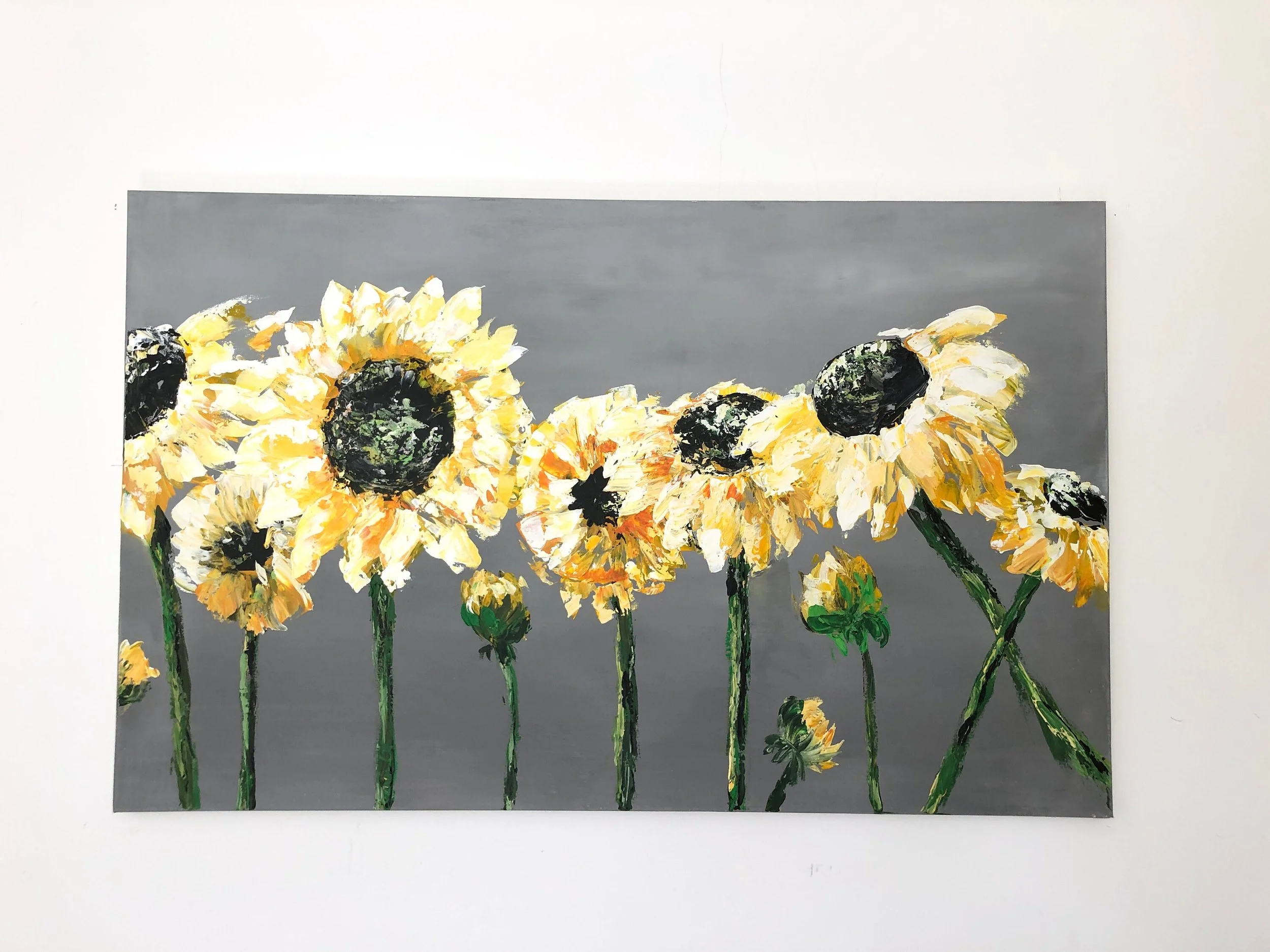 Gray and yellow beautiful large sunflower acrylic painting by Marcy Chapman 30" high x 40" wide