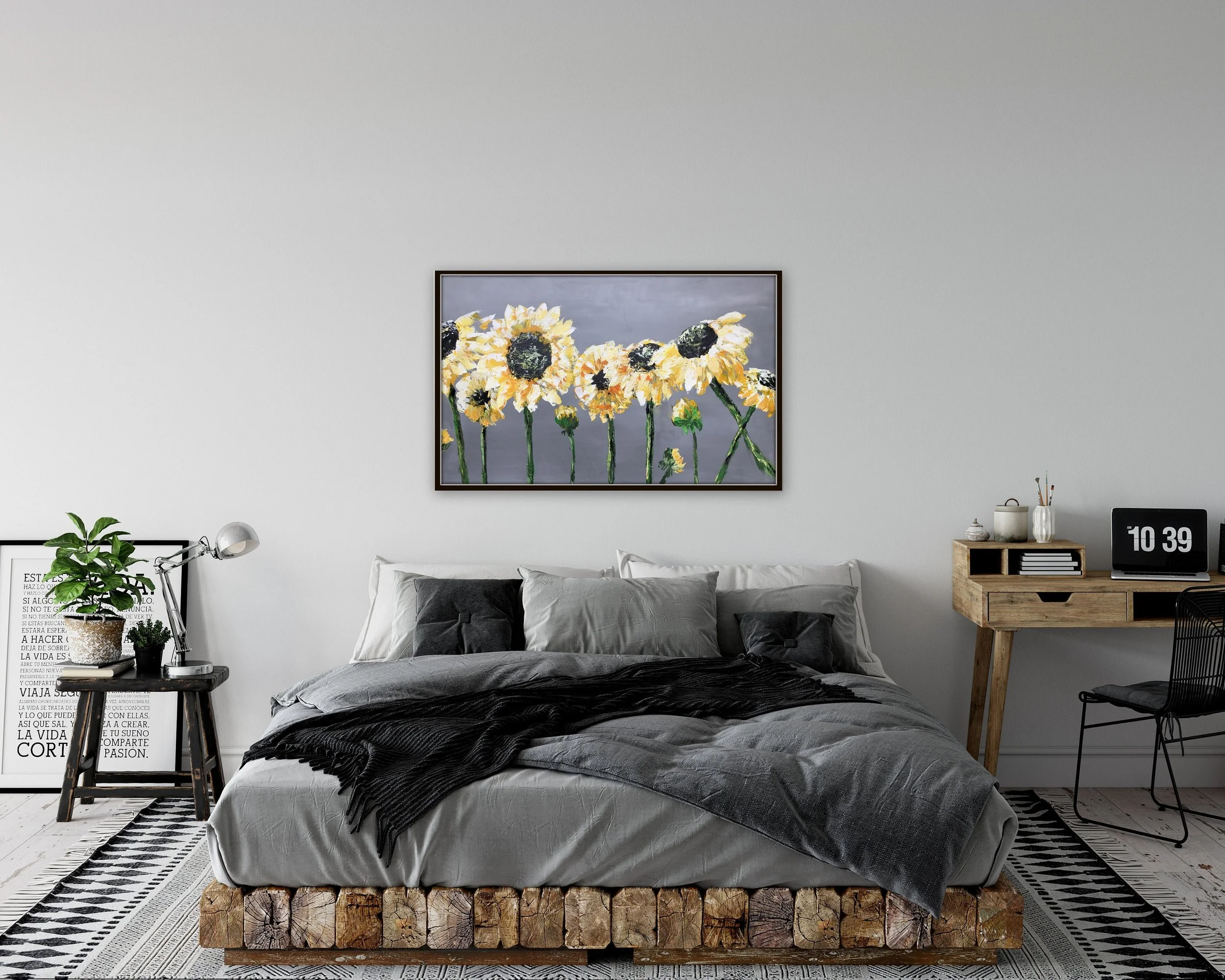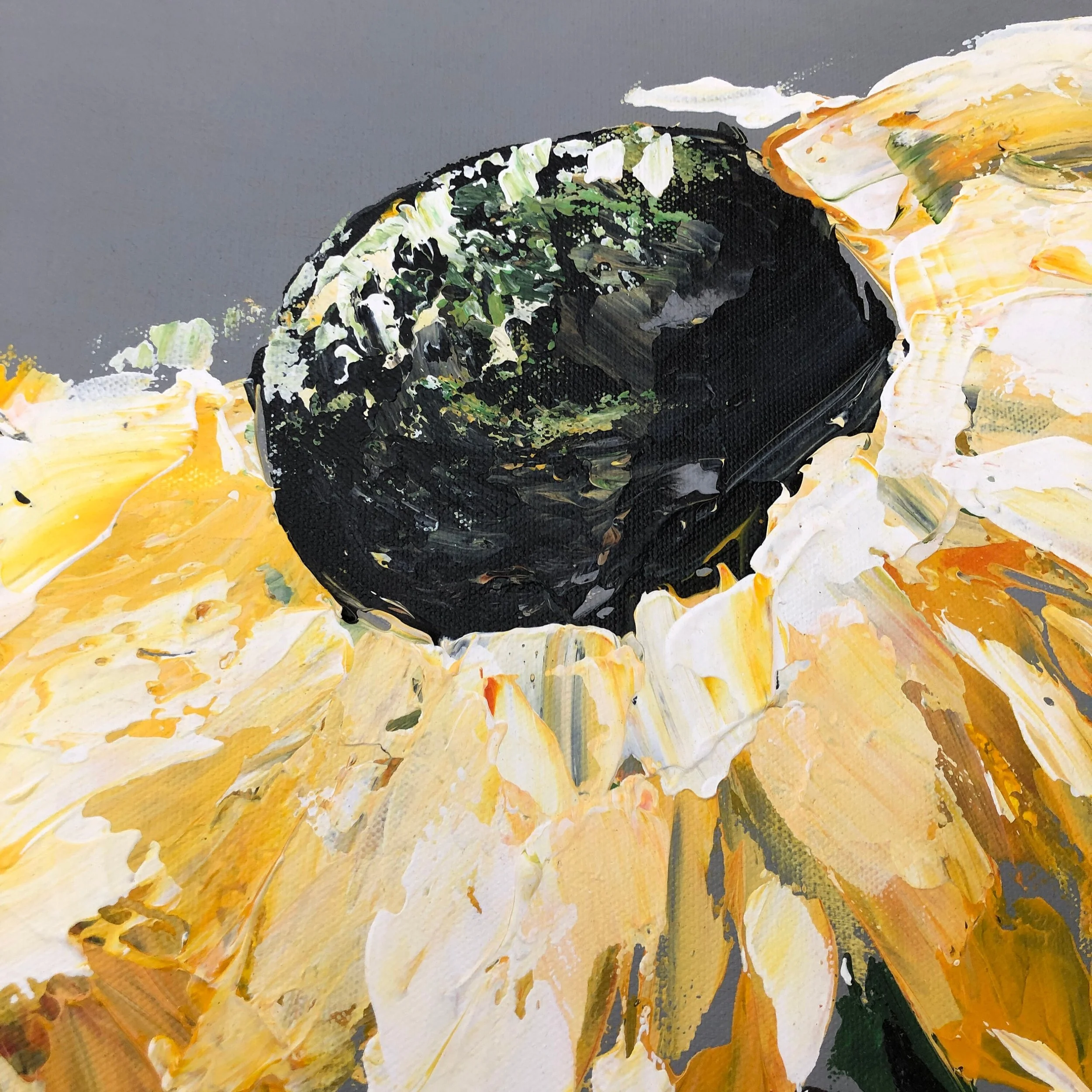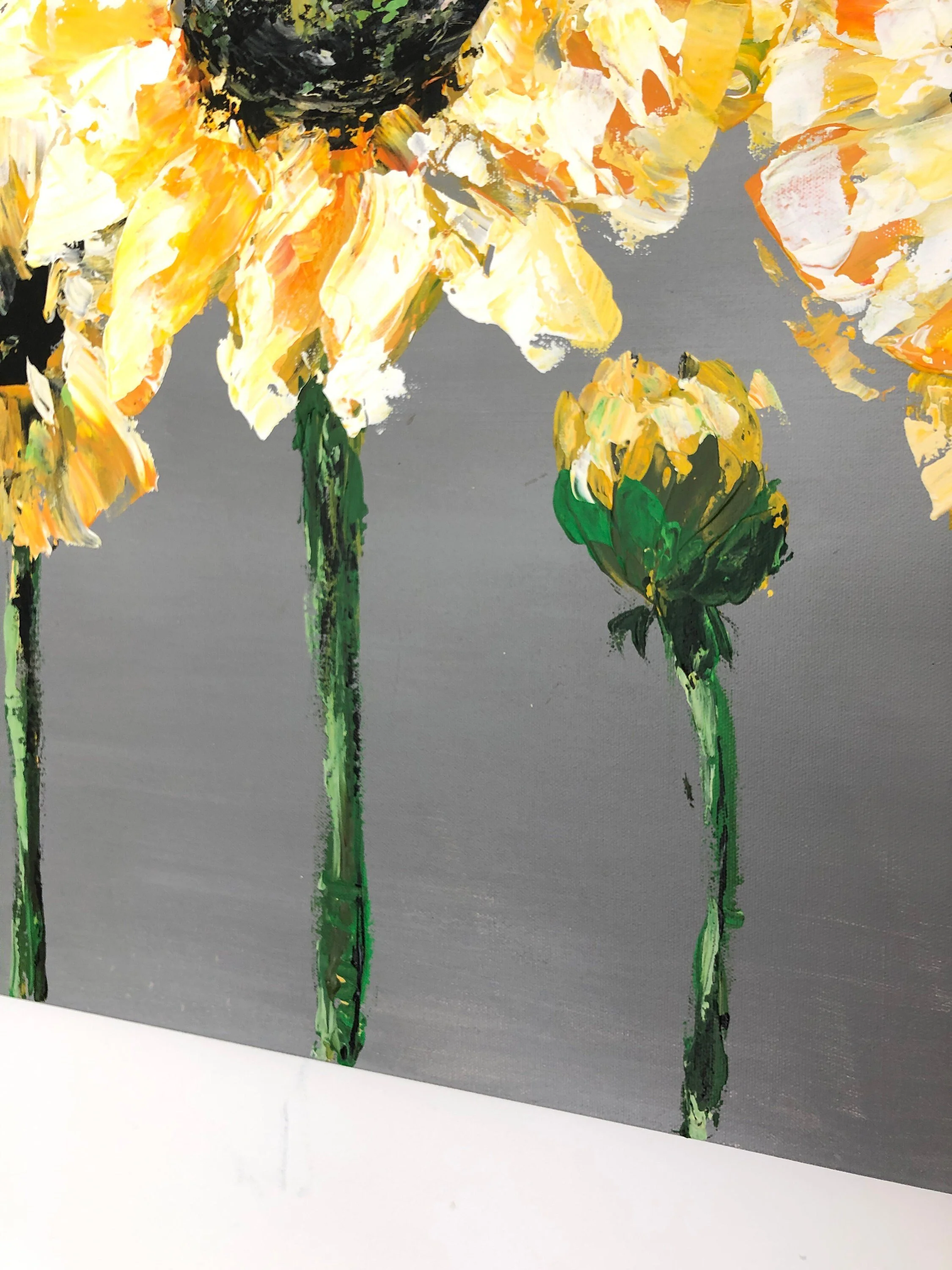 Gray and yellow beautiful large sunflower acrylic painting by Marcy Chapman 30" high x 40" wide