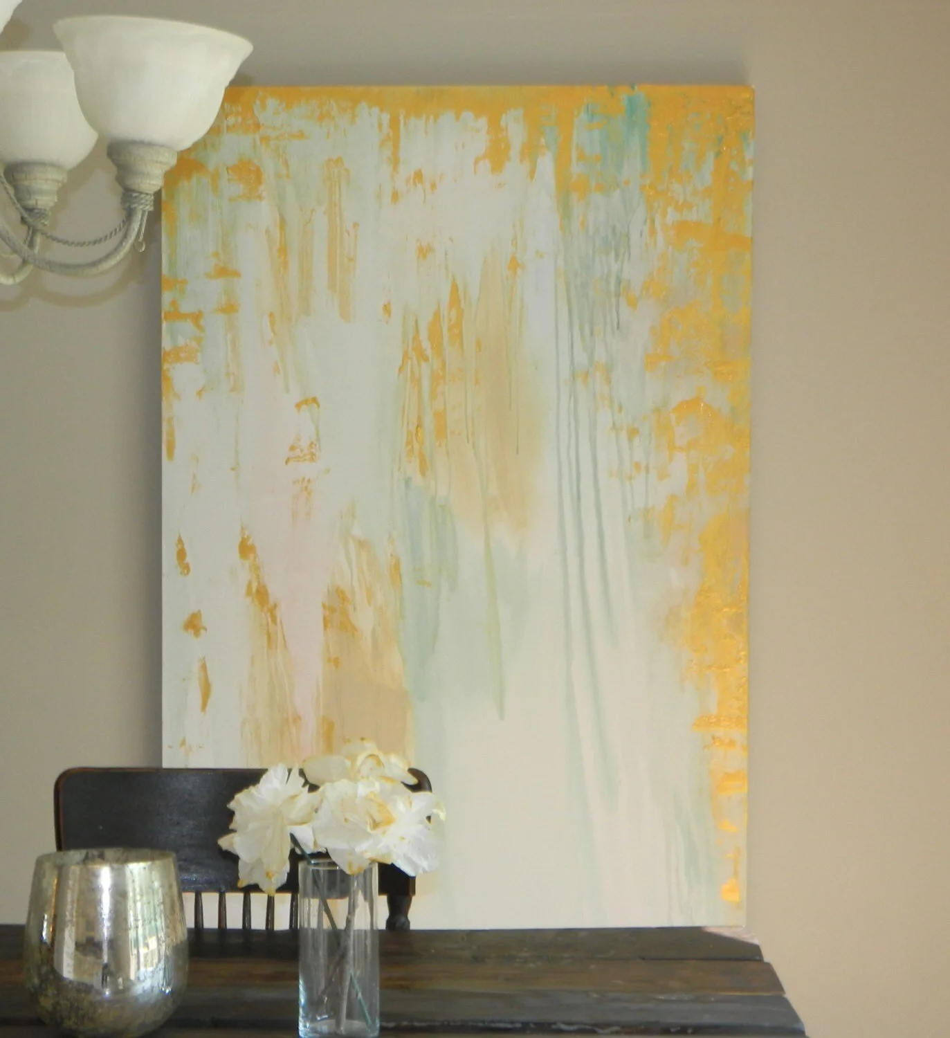 Original Artwork › Huge 60" x 42" XL Modern gold white turquoise blue abstract contemporary painting by Marcy Chapman large wall art decor elelgant artwork Image 1 of 3 Image 2 of 3 Image 3 of 3 Huge 60" x 42" XL Modern gold white turquoise blue abstract contemporary painting by Marcy Chapman large wall art decor elelgant artwork $399.99 sold out Large Original artwork by Marcy ChapmanShipped unstretched canvas only.Measures 60" x 42" with 3 inches around the edge to stretch or frame.FREE Shipping to USA other countries please contact me for shipping prices.If you like the photos of this painting I guarantee you will love it in person or receive a full refund (buyer pays return shipping).Please contact me with any questions. If you like this paiting but would like different colors or size, please contact me about a custom order!Thanks so much for you interest in my paintings. Please favorite my shop to see new listing when they are posted :)Have a great day! Primary color: Select Primary color Black Blue Brown Green Gray Orange Pink Purple Red White Yellow Size: Select Size contact me for size inches Get notified by email when this product is in stock. Sold Out Added! Large Original artwork by Marcy ChapmanShipped unstretched canvas only.Measures 60" x 42" with 3 inches around the edge to stretch or frame.FREE Shipping to USA other countries please contact me for shipping prices.If you like the photos of this painting I guarantee you will love it in person or receive a full refund (buyer pays return shipping).Please contact me with any questions. If you like this paiting but would like different colors or size, please contact me about a custom order!Thanks so much for you interest in my paintings. Please favorite my shop to see new listing when they are posted :)Have a great day!