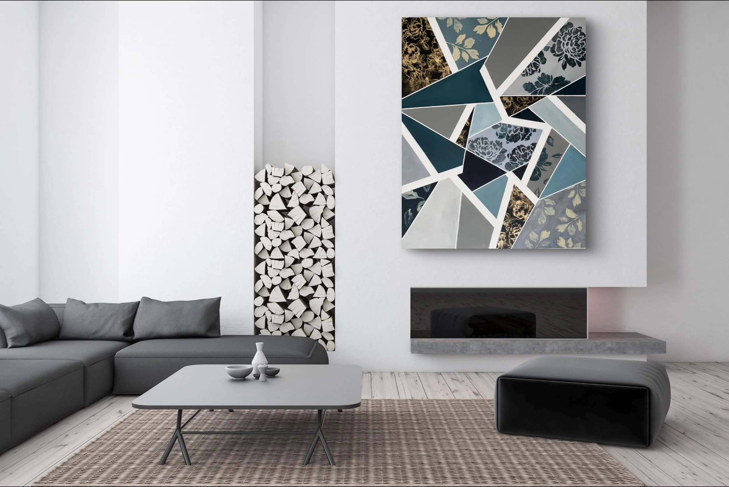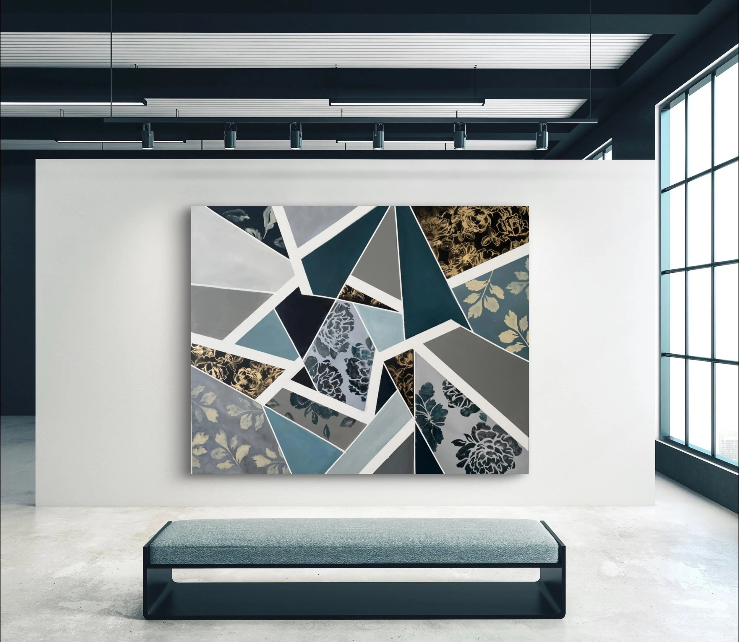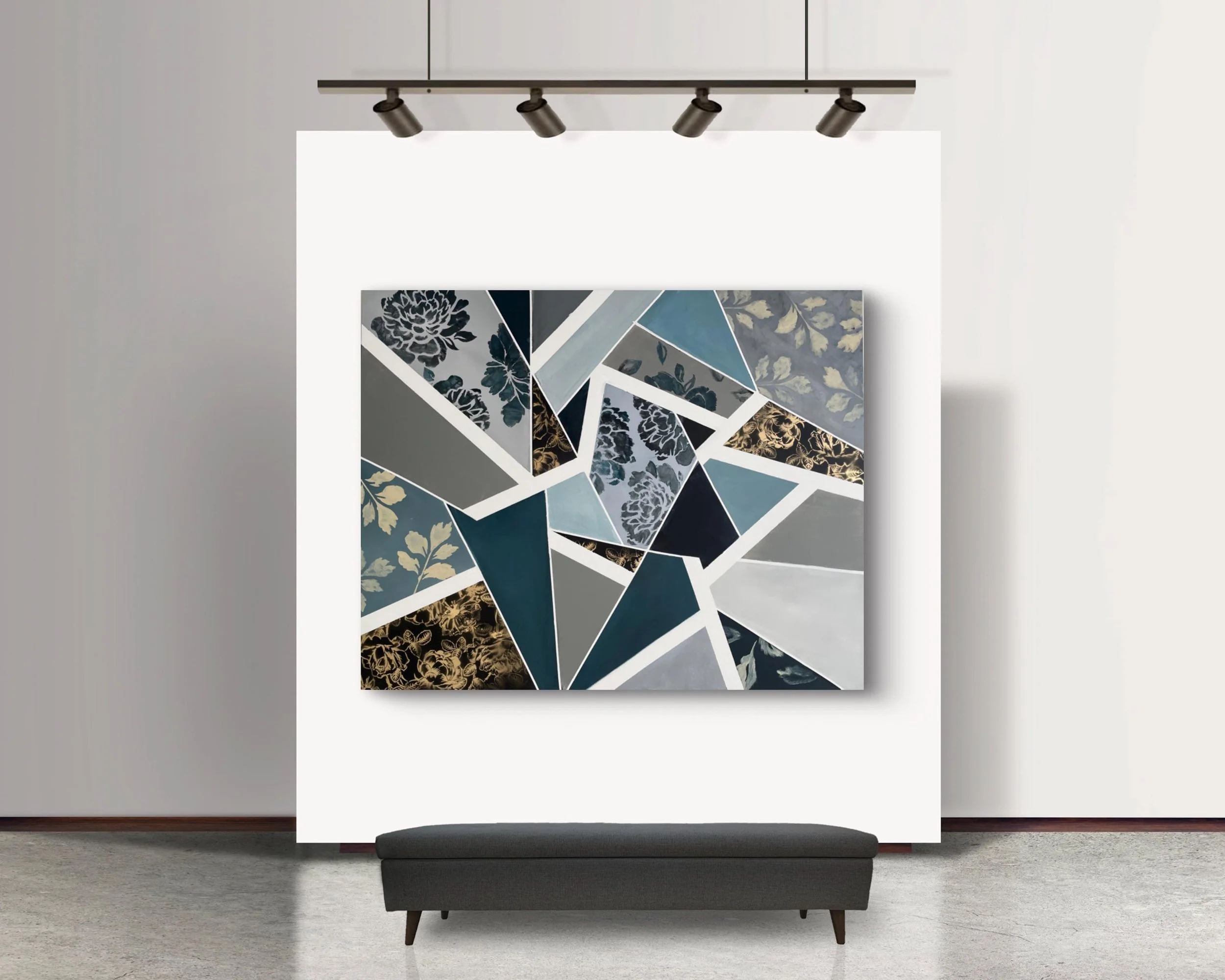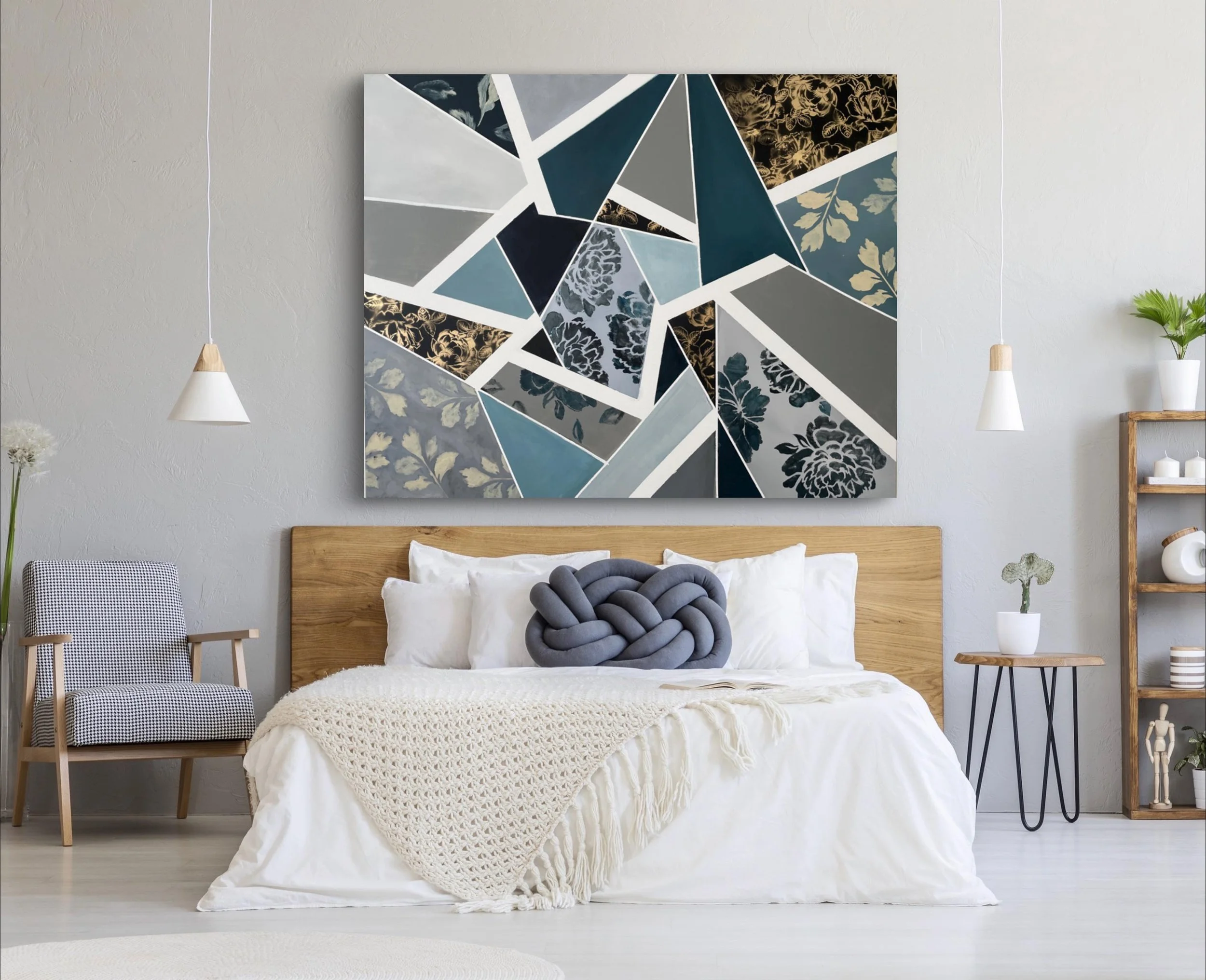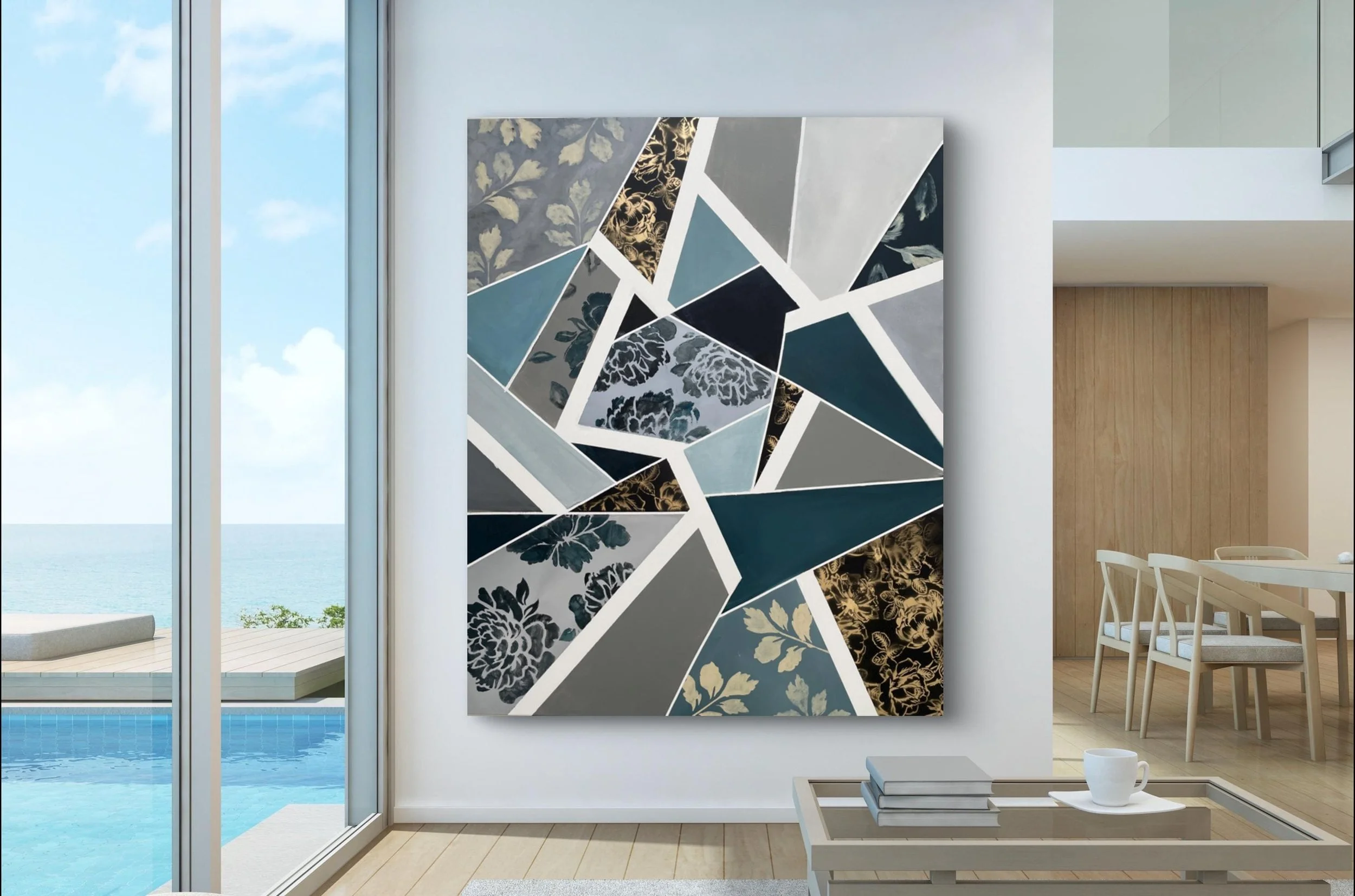 The designs resemble pieces of fabric cut in geometric shapes. Created in completion by Marcy Chapman, this is a very unique one-of-a-kind artwork you won’t find anywhere else.