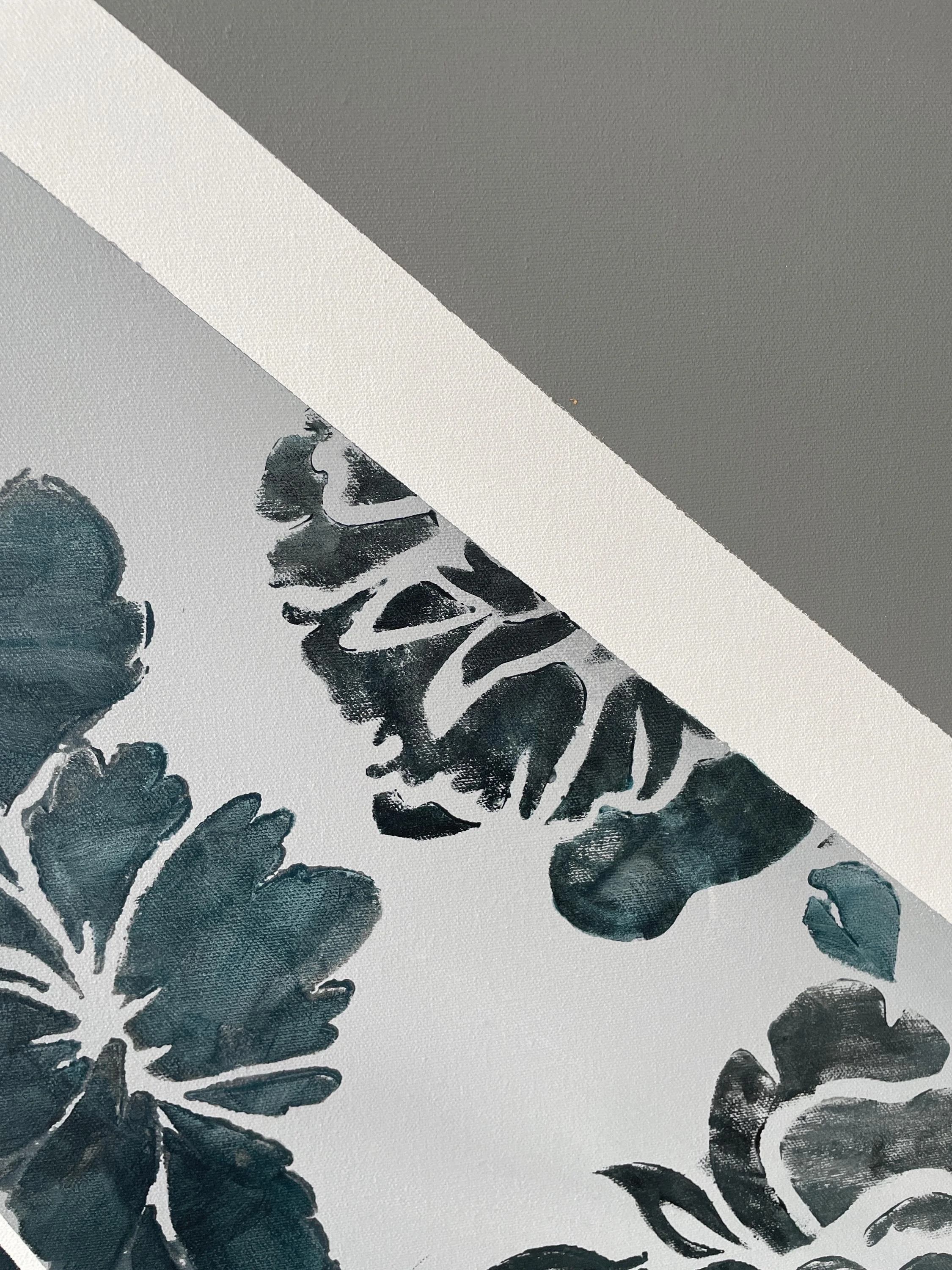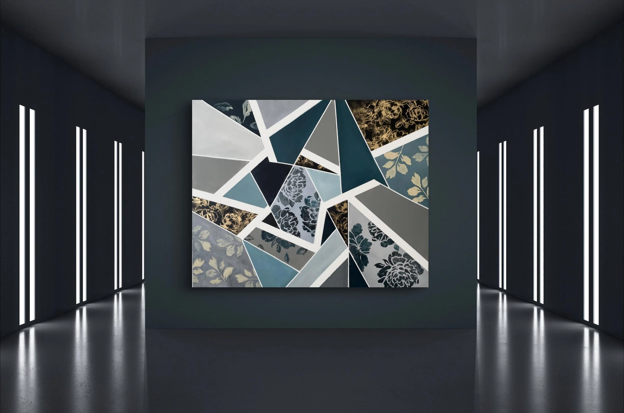Large Abstract Geometric Acrylic Painting, Blue Floral Pattern (60x48 inches)