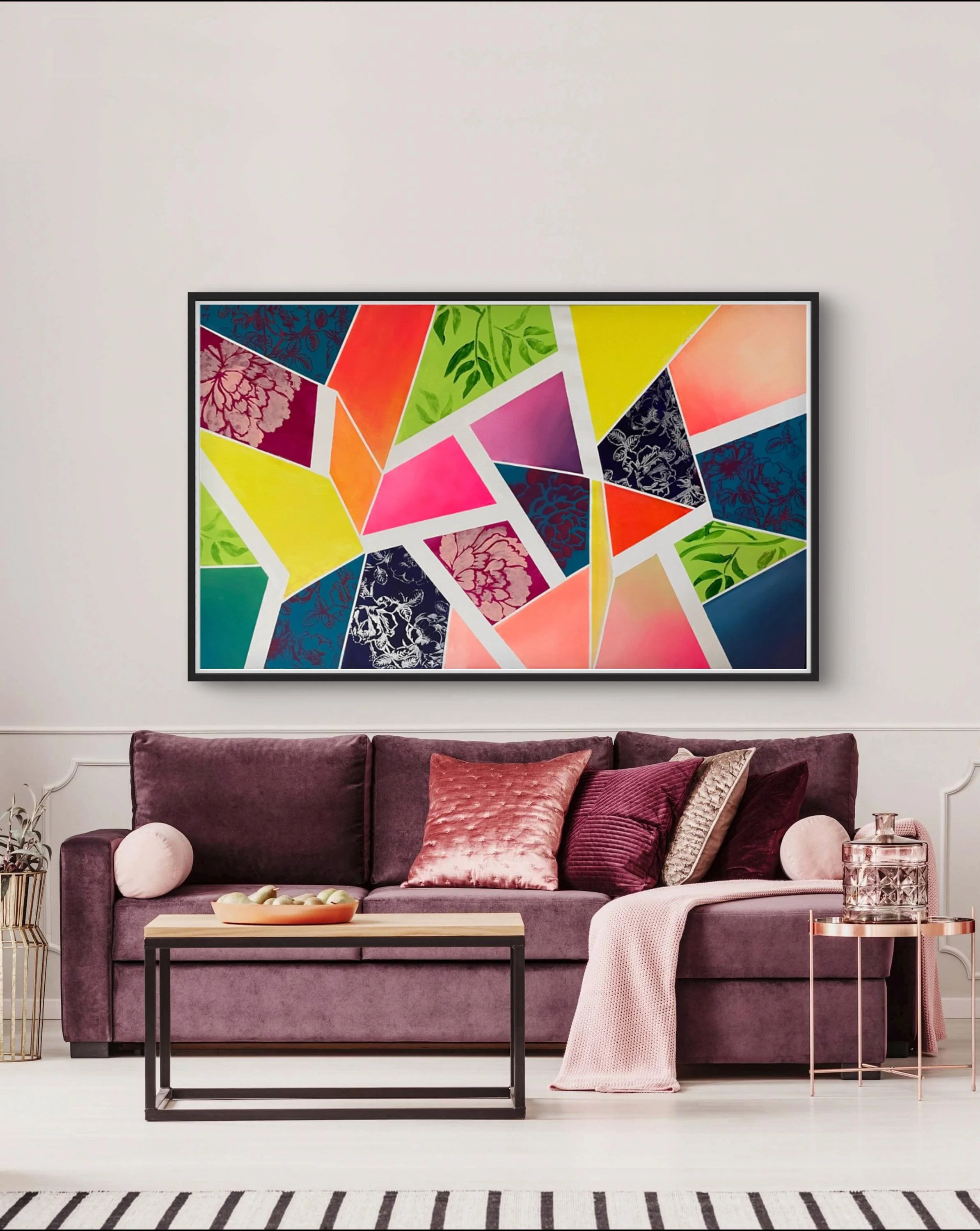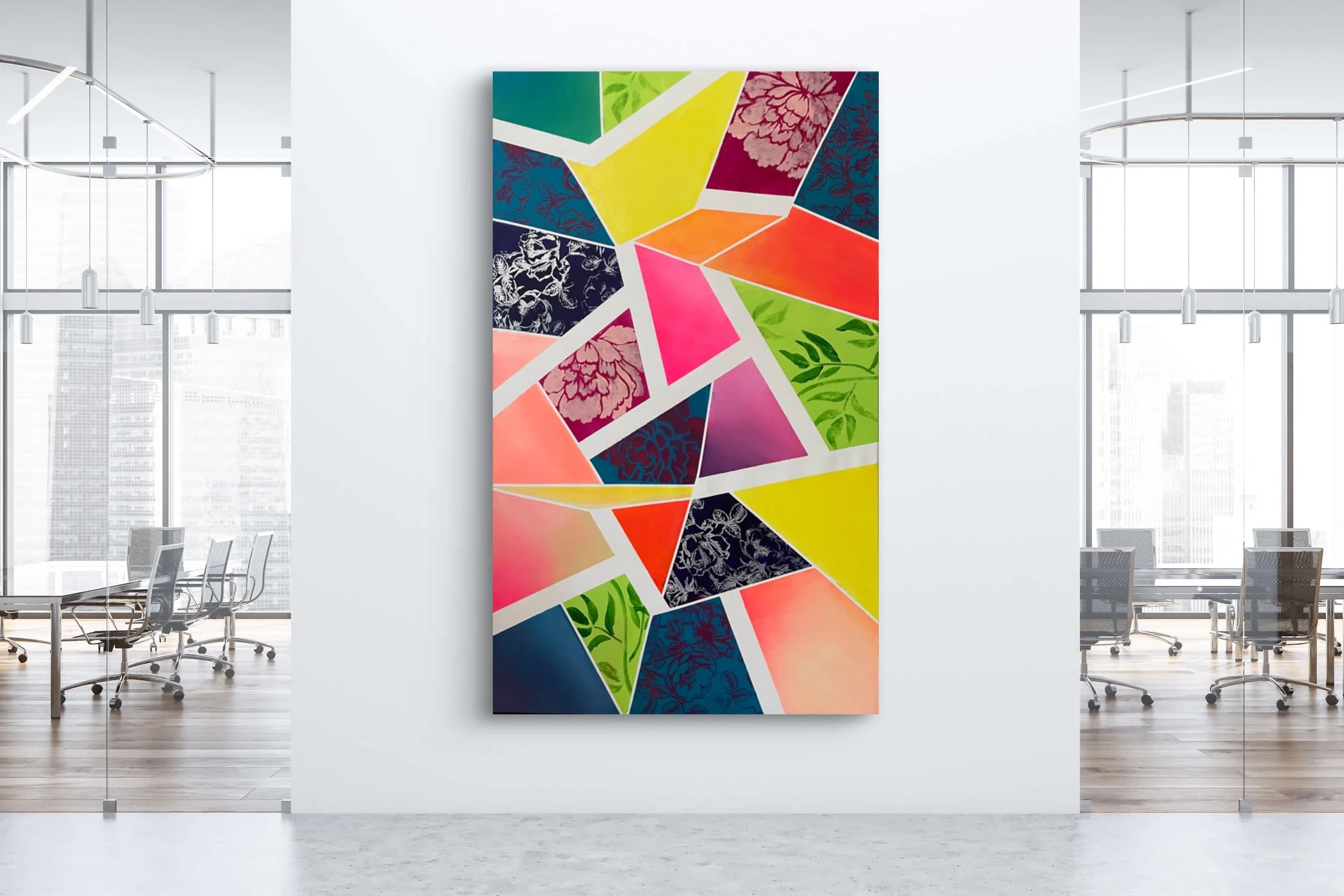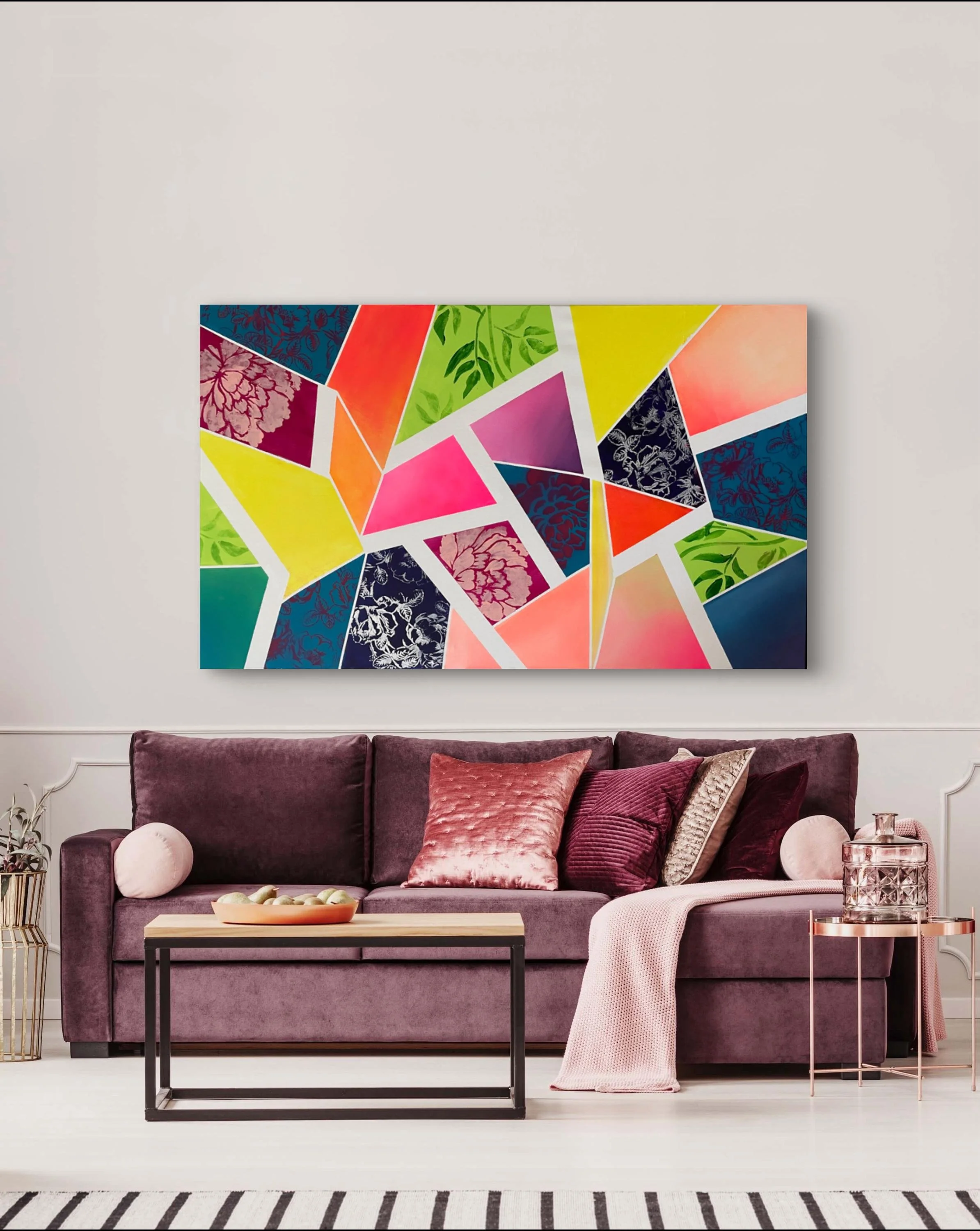 Large Abstract Geometric Painting, Pink Yellow Shapes, 36x60, Unstretched Canvas