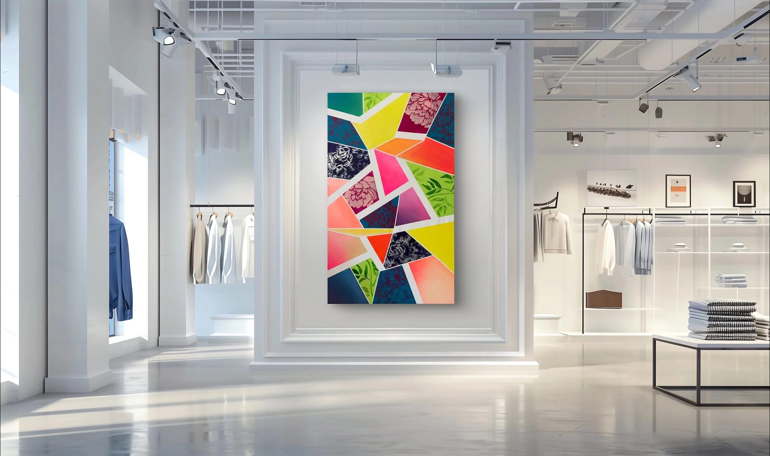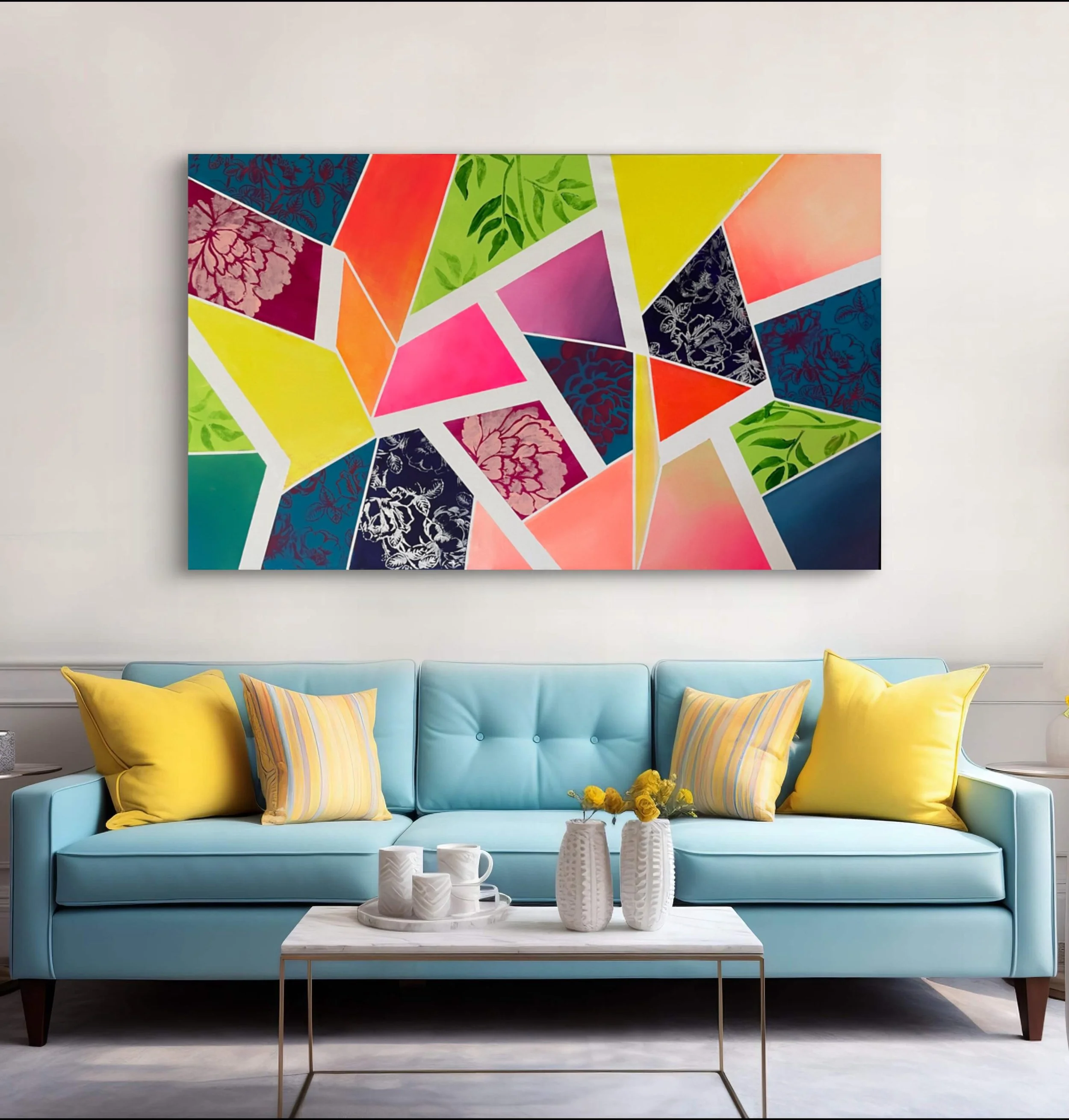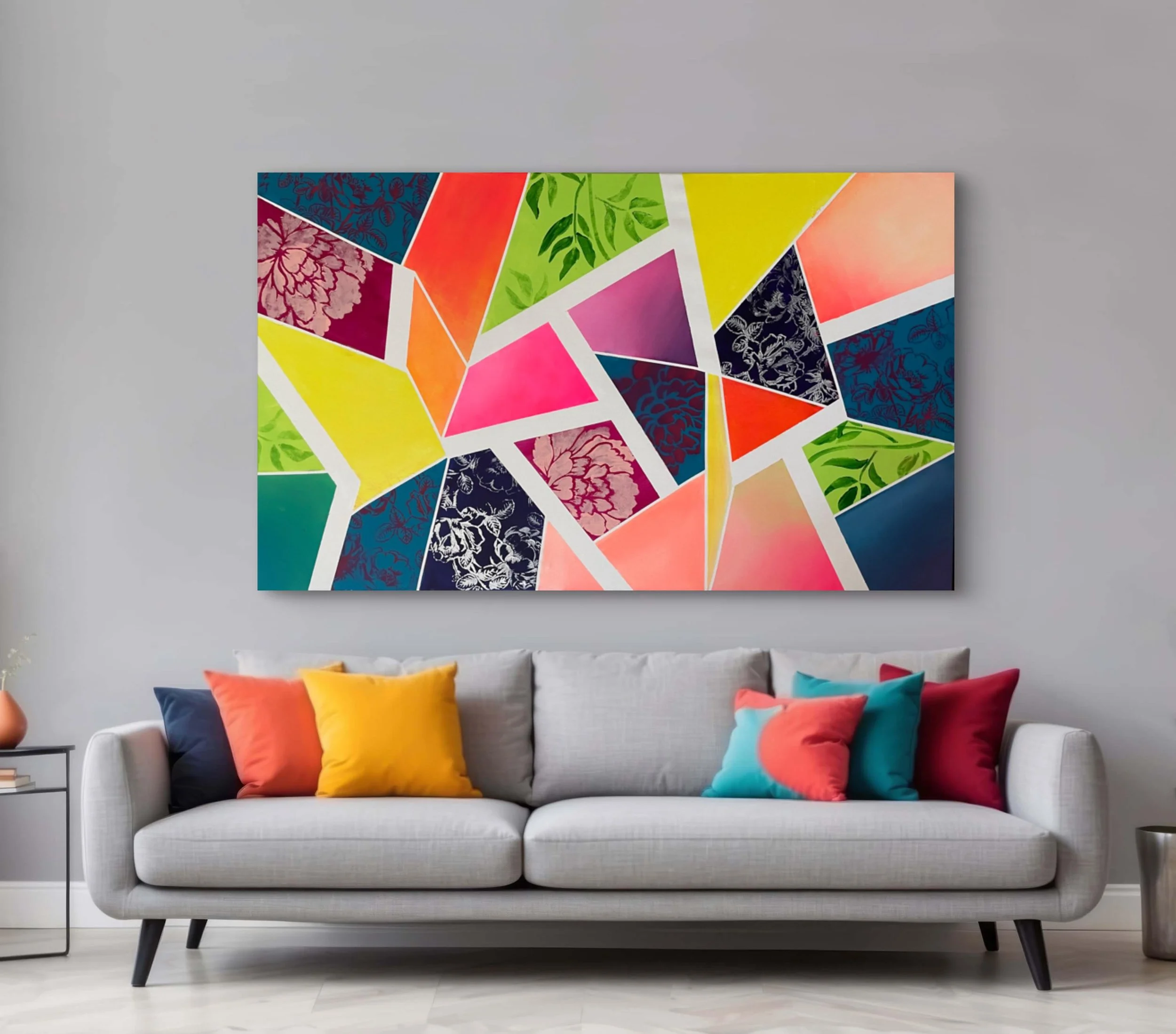 Large Abstract Geometric Painting, Pink Yellow Shapes, 36x60, Unstretched Canvas