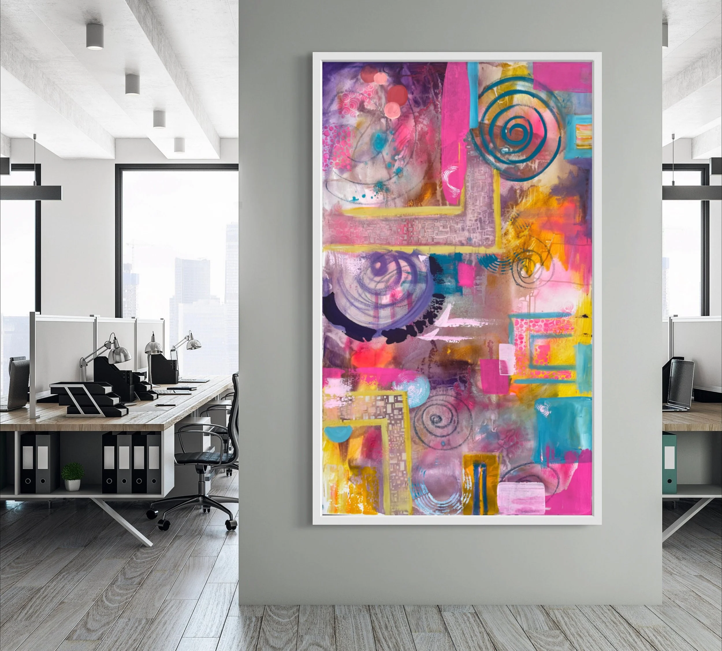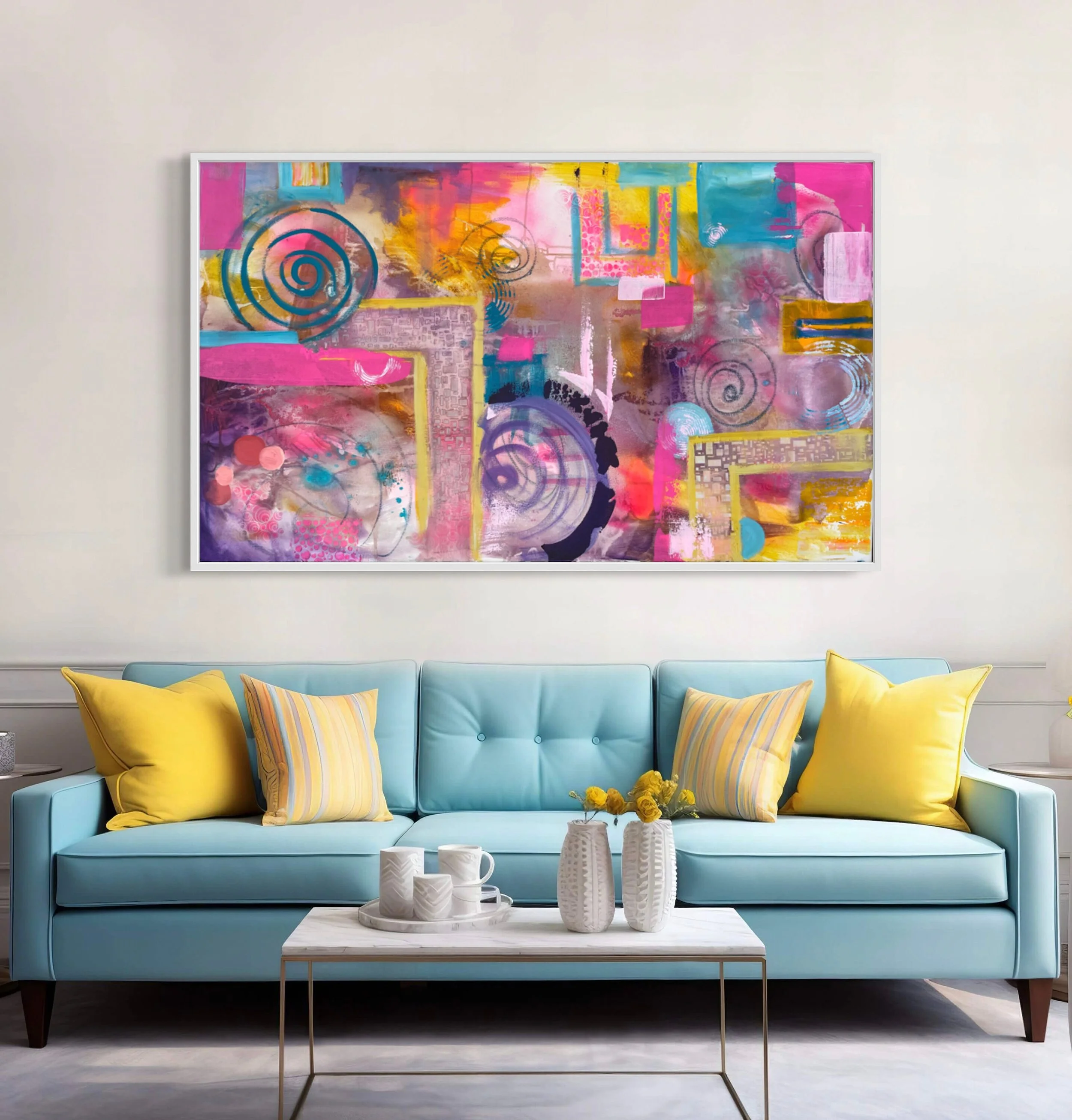 Large Abstract Painting, Pink Yellow Geometric Art, 36x60 Canvas