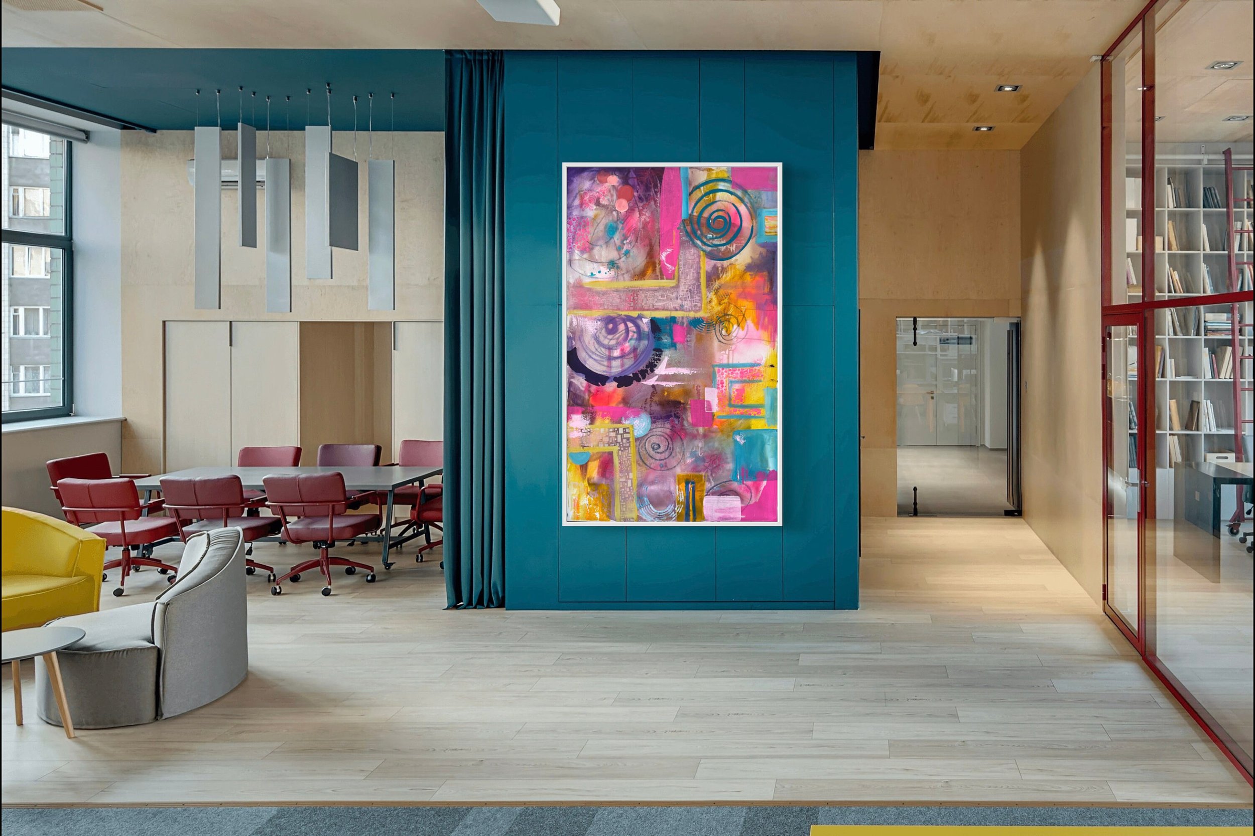 This is a large original abstract pop painting by Marcy Chapman. This painting can hang horizontally or vertically. Shipped unstretched canvas. This painting is very large So shipping will be rolled canvas painting only no frame included. Canvas will need to be stretched when arrived.