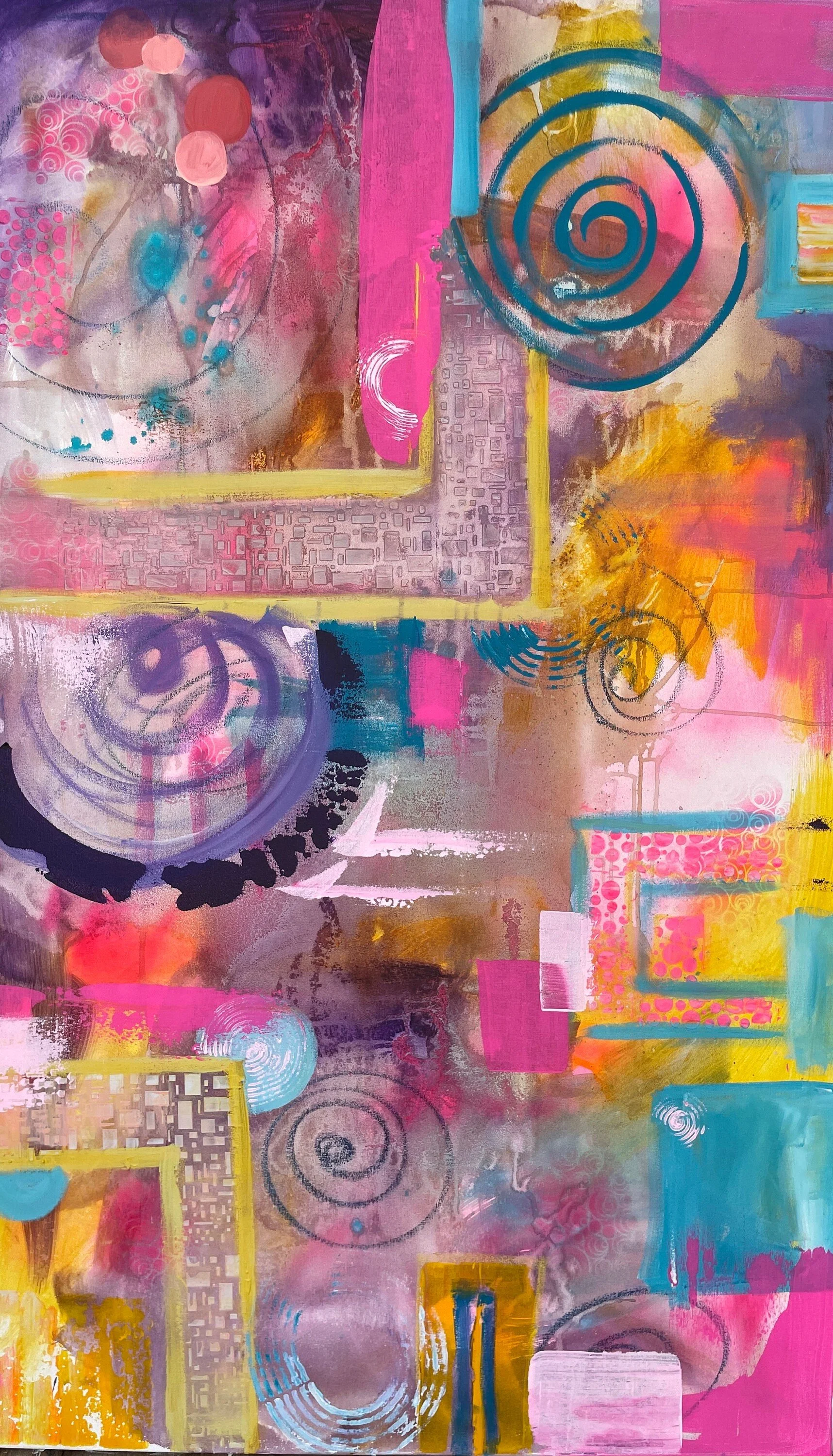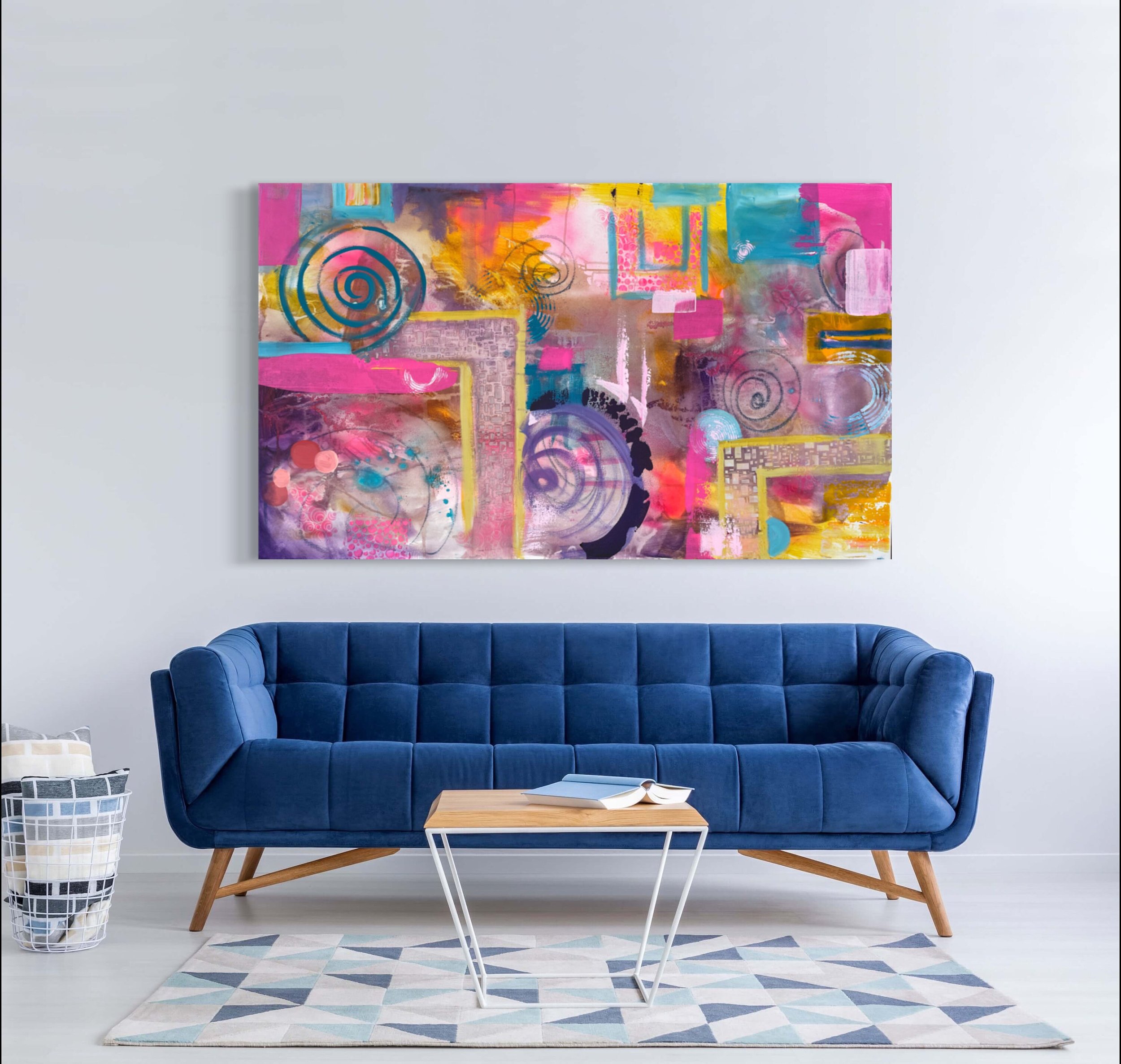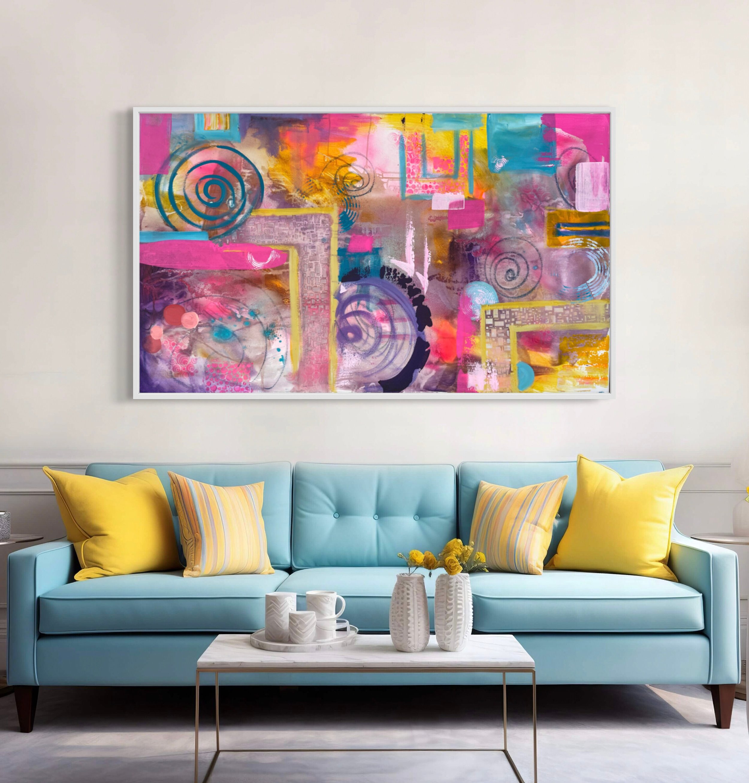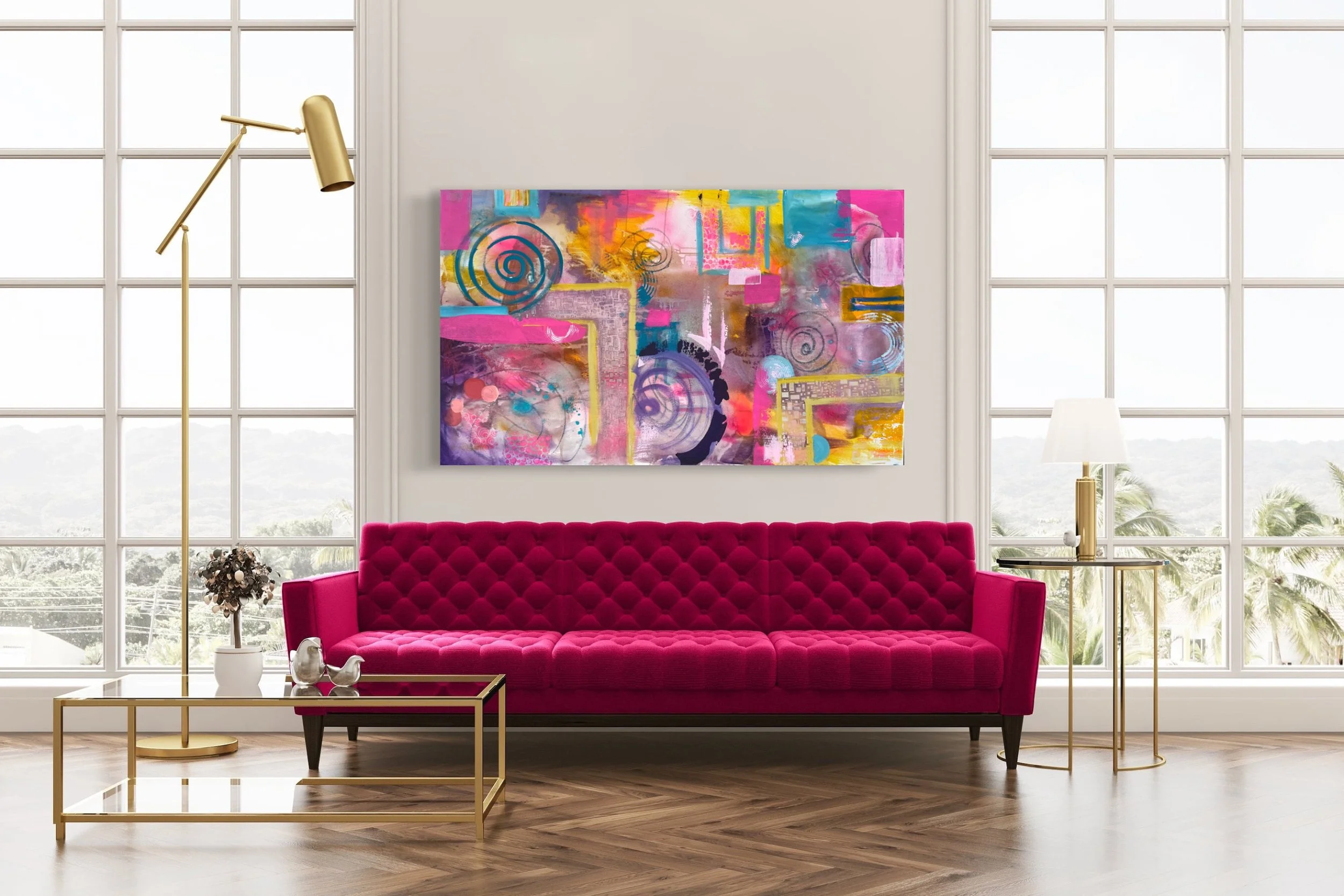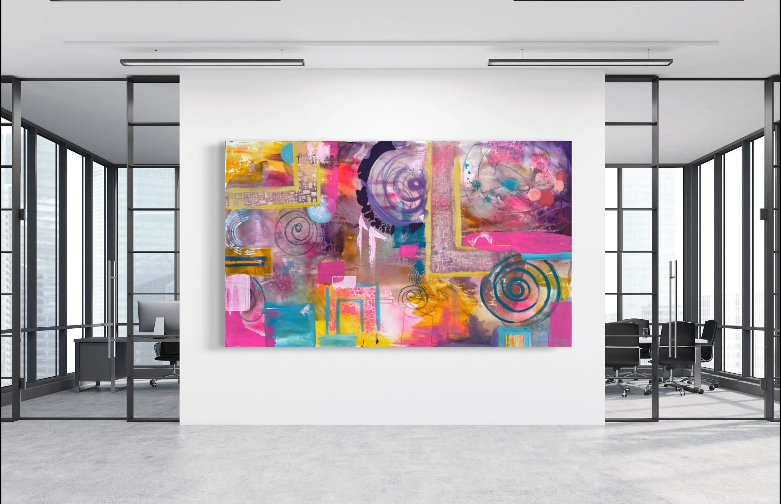 Large abstract pop art pretty colorful, huge wall art, huge abstract painting, commercial, office, bright colors pink yellow blue. turquoise