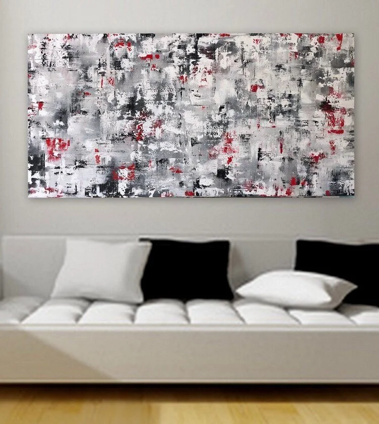 Remaining balance due $800 Paid deposit : $300 Custom order black white gray and red abstract acrylic painting. Size: 80” x 40” with extra canvas around edges for framing.