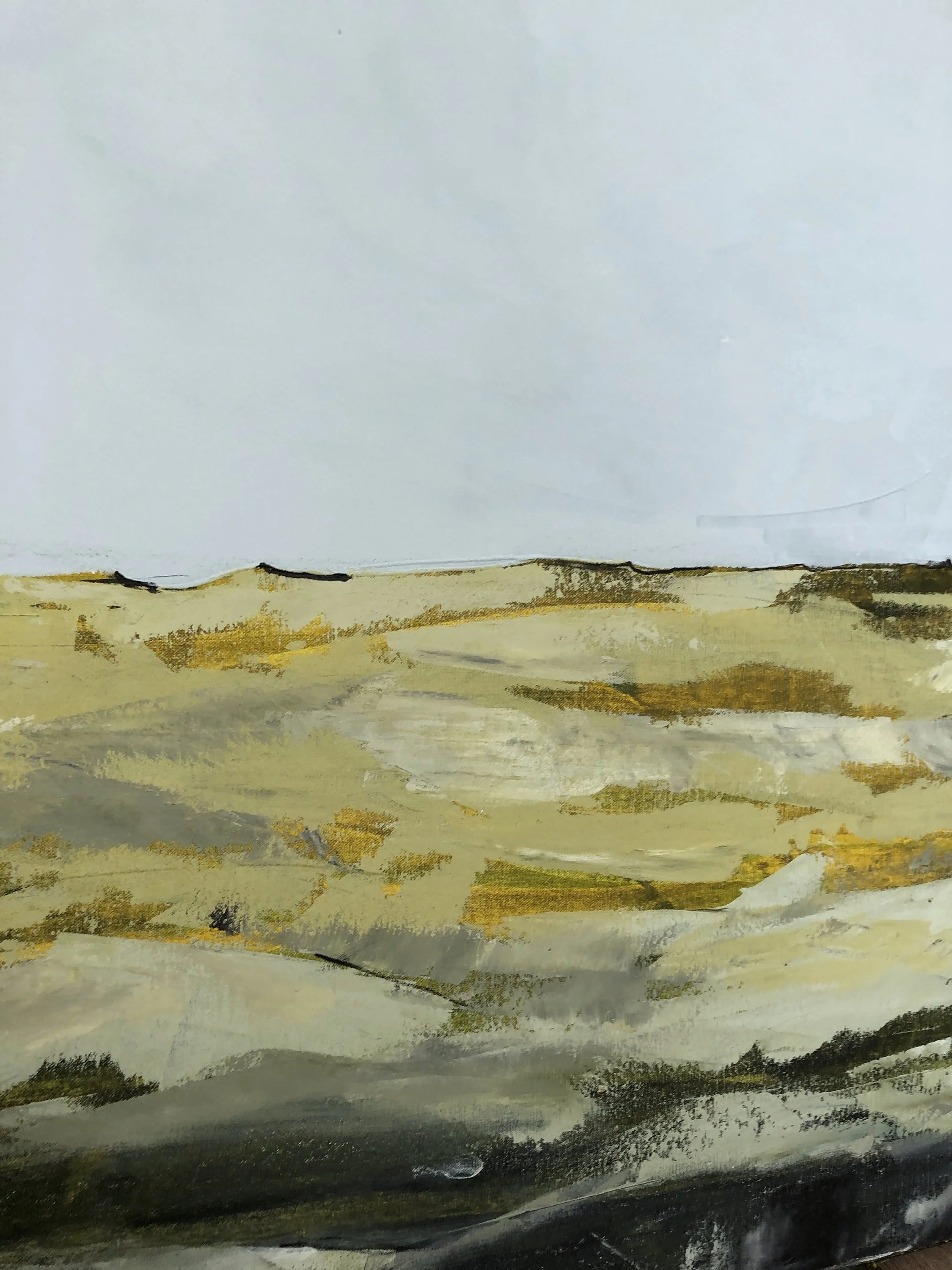 Such a pretty landscape of greens to add to the very light blue soft sky, this painting is sure to add color and comfort to any space.
