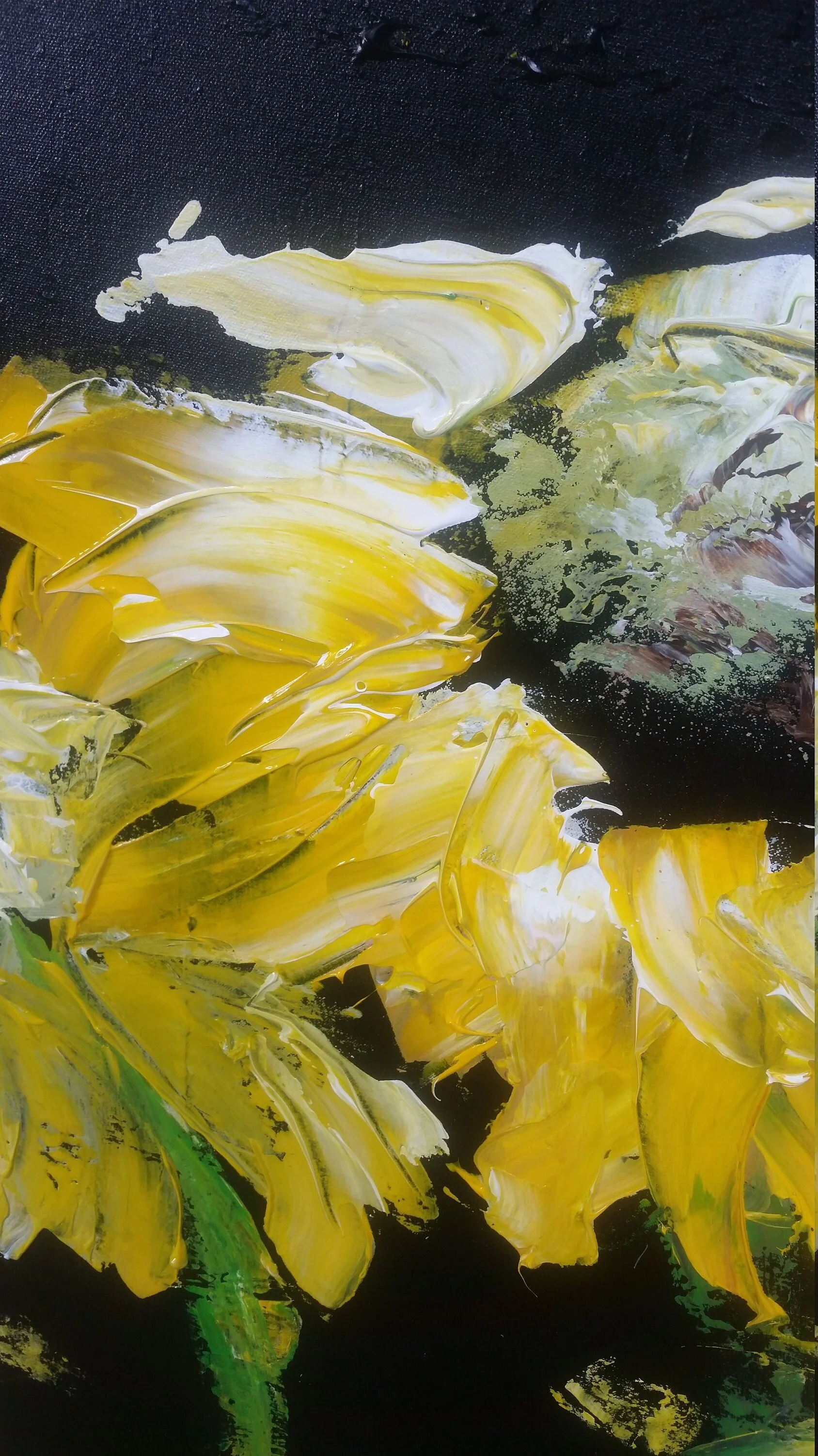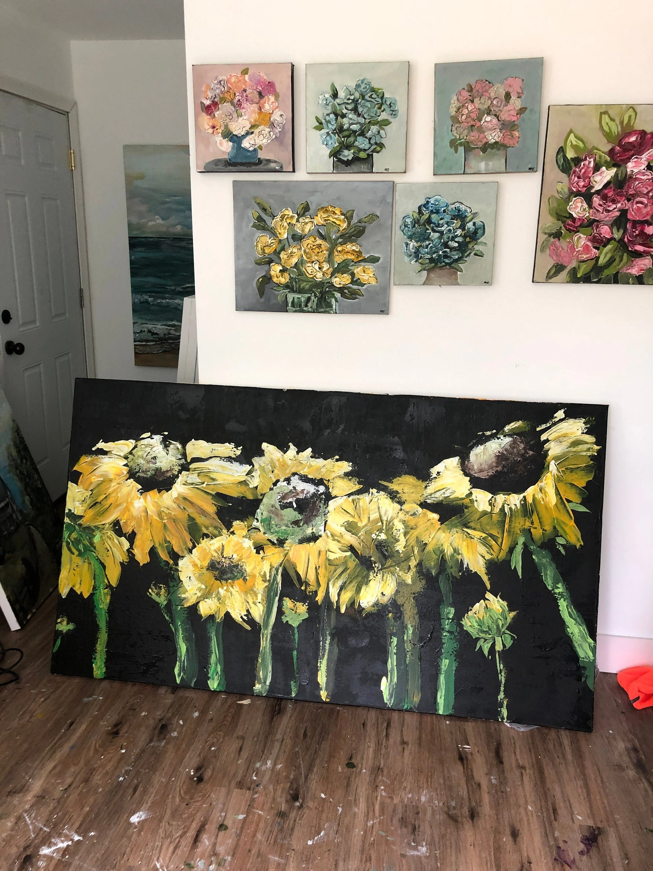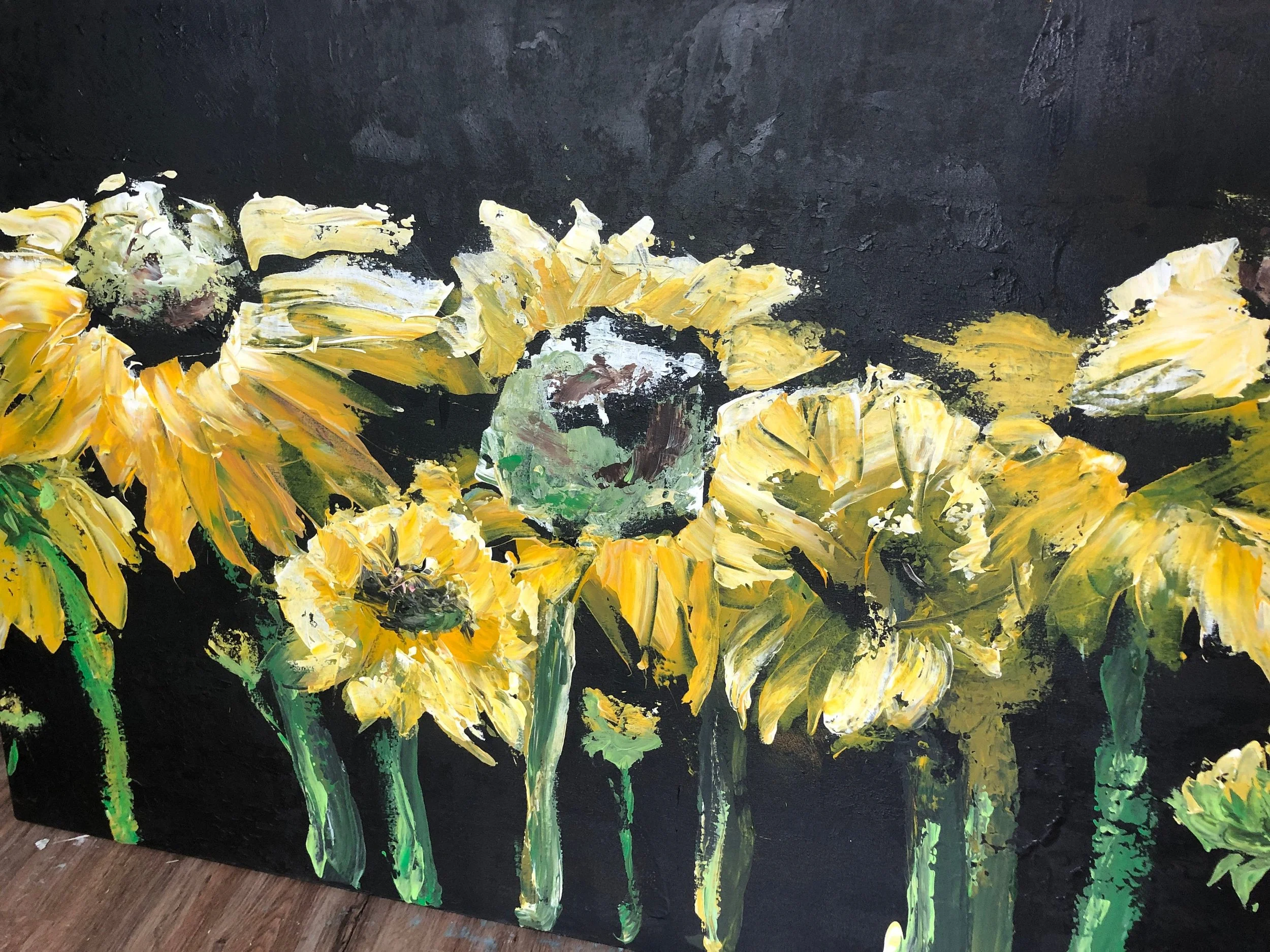 Original Artwork › Large Sunflower Acrylic Painting, Black Flower Wall Art, 70" x 40" Unstretched Canvas Image 1 of 5 Image 2 of 5 Image 3 of 5 Image 4 of 5 Image 5 of 5 Large Sunflower Acrylic Painting, Black Flower Wall Art, 70" x 40" Unstretched Canvas $250.00 Large Sunflower painting by Marcy ChapmanI love how dramatic the bold yellow pops against the textured black background.This would look great above your sofa with pops of yellow or black pillows, throw or furniture.This is a huge 70” x 40" x 3" paintingThis painting will need to be framed upon arrival, shipped unstretched canvasFree shipping worldwide!Please contact me with any questions or concerns.Also I customize for you! Contact me for any size or style painting request! Get notified by email when this product is in stock. Add To Cart Added! Large Sunflower painting by Marcy ChapmanI love how dramatic the bold yellow pops against the textured black background.This would look great above your sofa with pops of yellow or black pillows, throw or furniture.This is a huge 70” x 40" x 3" paintingThis painting will need to be framed upon arrival, shipped unstretched canvasFree shipping worldwide!Please contact me with any questions or concerns.Also I customize for you! Contact me for any size or style painting request!