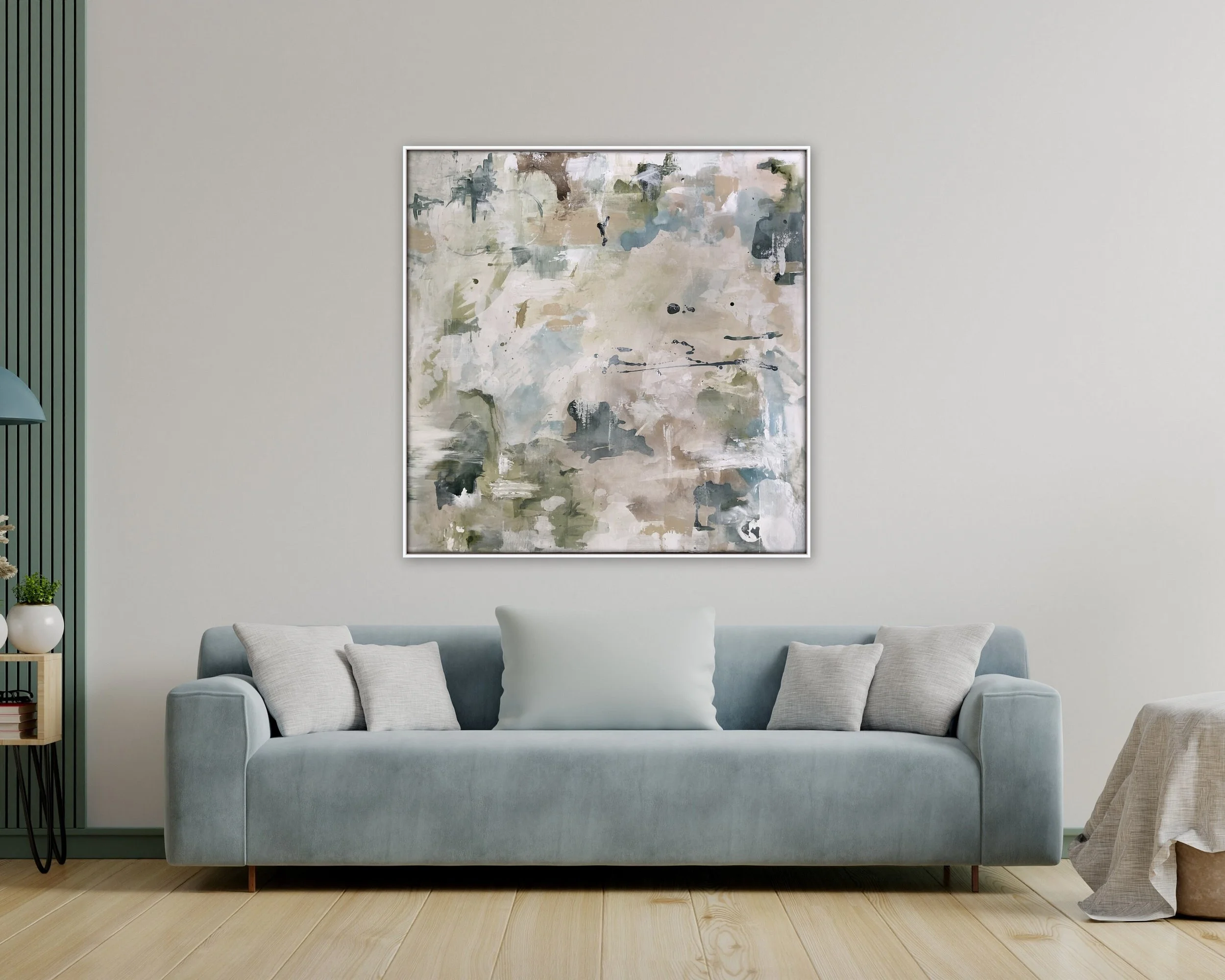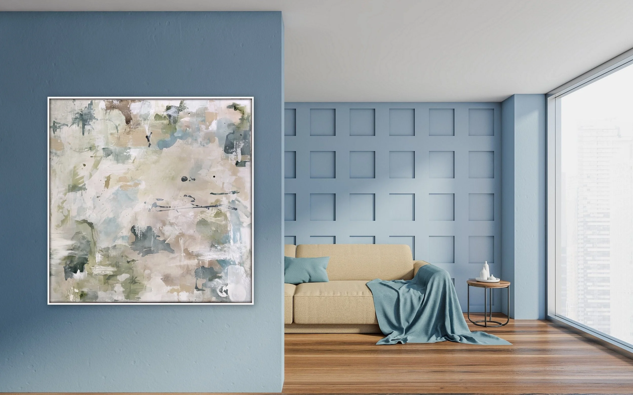 Original abstract painting contemporary art, 48 inch, square blue wall art cream painting, by Marcy Chapman