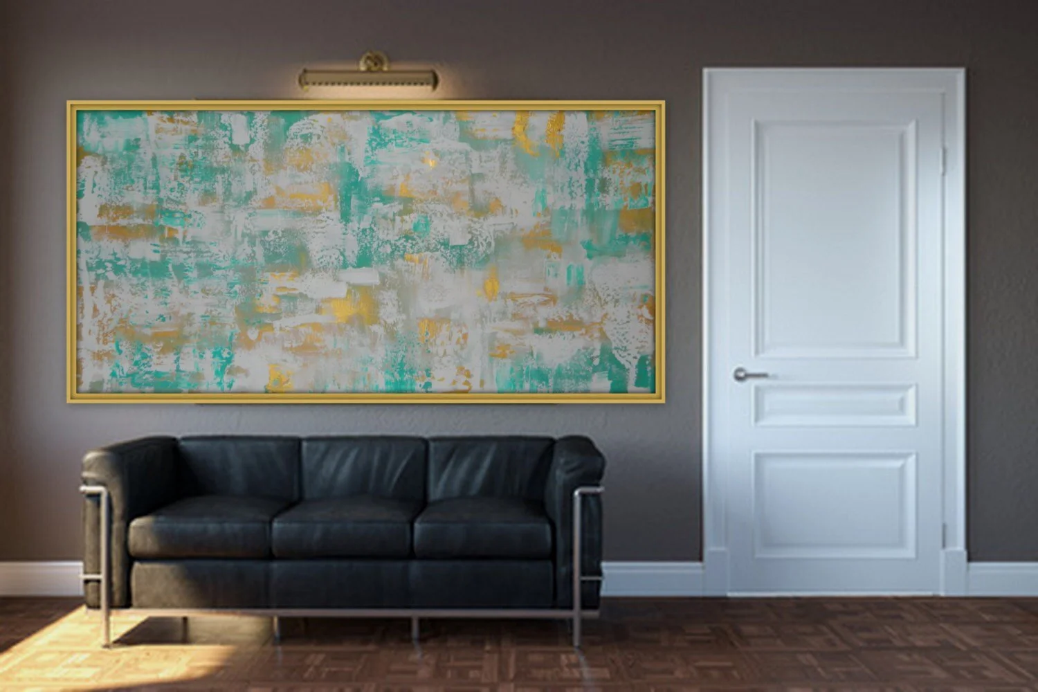 Original Artwork › XL Abstract painting by Marcy Chapman turquoise gold and white acrylic painting 29.5" x 60.5" unstretched canvas artwork wall art decor Image 1 of 5 Image 2 of 5 Image 3 of 5 Image 4 of 5 Image 5 of 5 XL Abstract painting by Marcy Chapman turquoise gold and white acrylic painting 29.5" x 60.5" unstretched canvas artwork wall art decor $399.99 sold out XL abstract paintings in gold turquoise and white by Marcy ChapmanGold frame not included, shown for suggested framing onlyThis painting measures 29.5 x 60" unstretched with 3 inches around the edges painted whiteRolled/ UNstretched canvas shipped free to USA in a sturdy tube or box2 day shippingGuaranteed satisfaction Certificate of AuthenticityTo Custom order something like this please contact me.I can create custom size paintings and custom colorsThank you for your interest in my paintings Please check my out my other listing on my shop page.mecart.etsy.com Primary color: Black Blue Brown Green Gray Orange Pink Purple Red White Yellow turquoise gold white Get notified by email when this product is in stock. Sold Out Added! XL abstract paintings in gold turquoise and white by Marcy ChapmanGold frame not included, shown for suggested framing onlyThis painting measures 29.5 x 60" unstretched with 3 inches around the edges painted whiteRolled/ UNstretched canvas shipped free to USA in a sturdy tube or box2 day shippingGuaranteed satisfaction Certificate of AuthenticityTo Custom order something like this please contact me.I can create custom size paintings and custom colorsThank you for your interest in my paintings Please check my out my other listing on my shop page.mecart.etsy.com